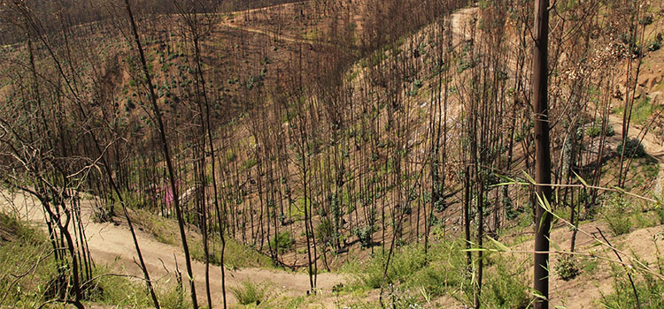 Aspecto de una plantación de Eucalyptus globulus en Valparaíso (Chile) en octubre de 2017, tras un incendio sufrido nueve meses antes (enero 2014). Tras el incendio, queda expuesto a la acción erosiva de la lluvia el suelo desnudo como consecuencia del desmonte previo a la plantación.