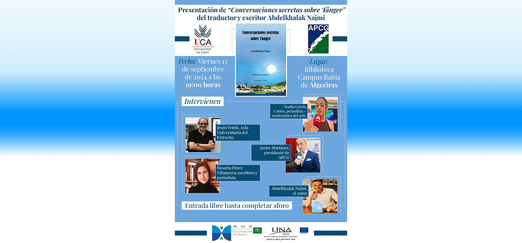 El Aula Universitaria del Estrecho (AUE) organiza hoy, viernes 13, a las 19 horas, la presentación del libro ‘Conversaciones secretas sobre Tánger’ del traductor y escritor Abdelkhalak Najmi, que se desarrollará en la biblioteca del Campus Bahía de Algeciras. En el acto – moderado por la periodista Noelia García Cortés – intervendrán, además del autor, […]