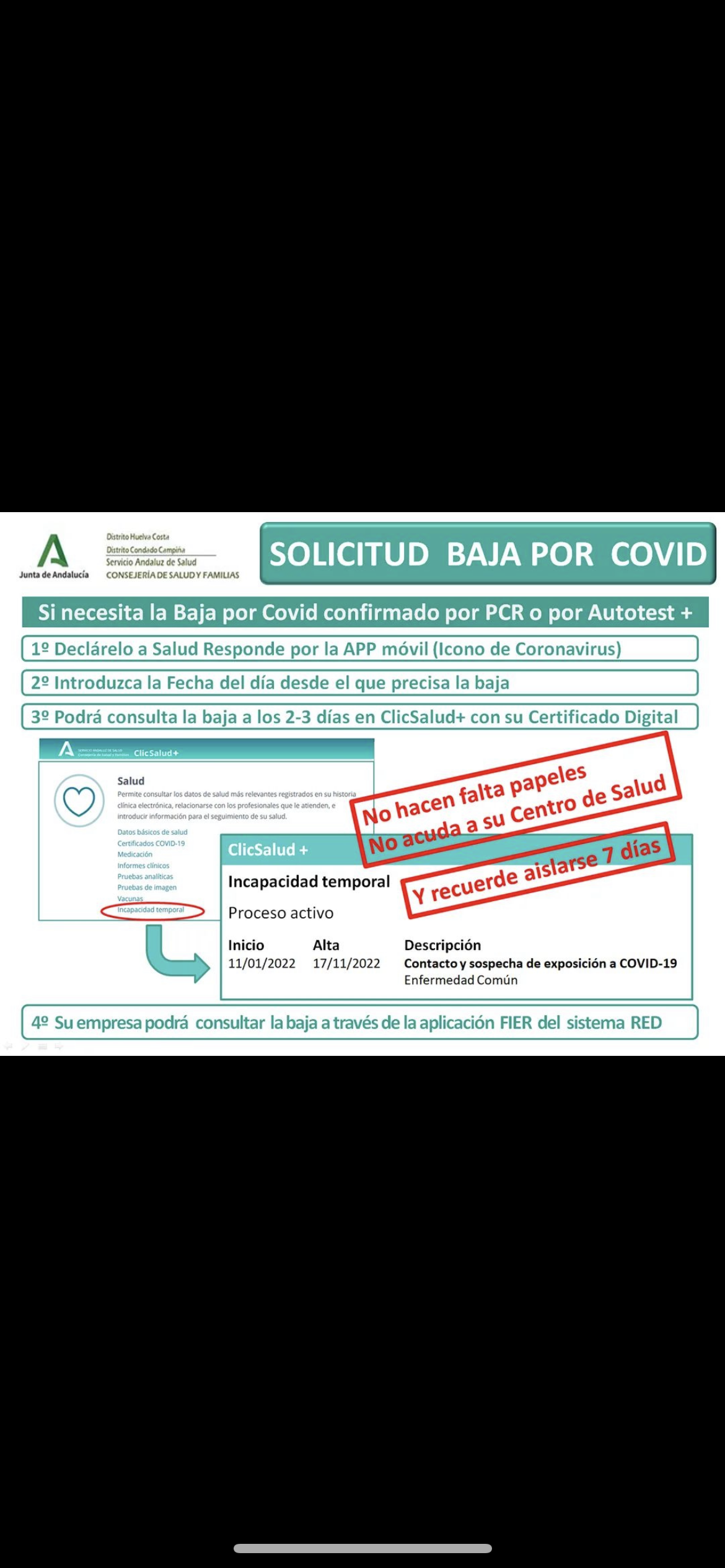 Solicitud de baja por COVID de la Junta de Andalucía.