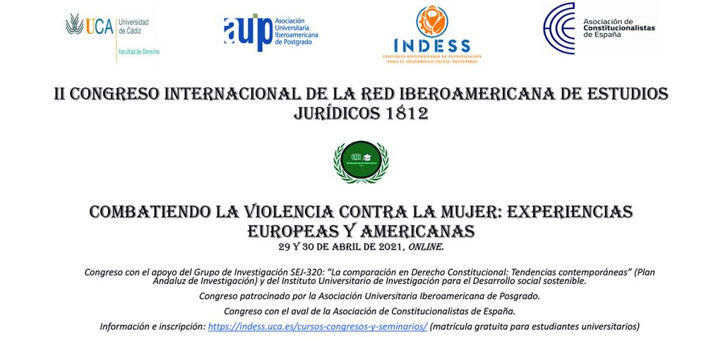“La Red iberoamericana de Estudios Jurídicos 1812, que coordina la Universidad de Cádiz, celebra durante los próximos días 29 y 30 de abril su II congreso internacional, que llevará por título Combatiendo la violencia contra la mujer: experiencias europeas y americanas (on line).