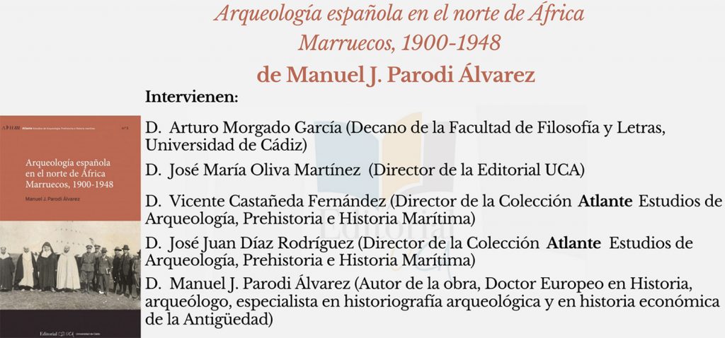 Editorial UCA-Servicio de Publicaciones recuerda a la comunidad universitaria que el miércoles 16 de febrero, a las 12:30 horas, tendrá lugar en el Salón de Grados de la Facultad de Filosofía la presentación del libro Arqueología española en el norte de África. Marruecos, 1900-1948, de Manuel J. Parodi Álvarez.