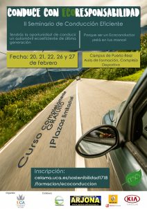 La II Edición del Seminario “Conduce con Eco-responsabilidad” tendrá lugar en el Campus de Puerto Real del los días 20, 21, 22, 26 y 27 de febrero en horario de tarde y con un total de 25 horas. Solicitado a la Comisión de Ordenación Académica, Profesorado y Alumnos el reconocimiento de esta Actividad como 1 crédito ECTS y aprobado definitivamente el pasado 27 de septiembre de 2017.