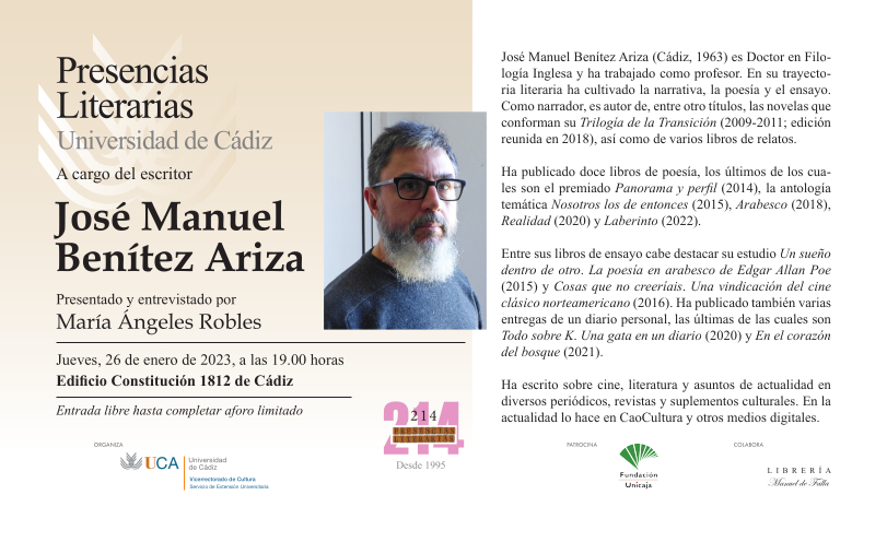 El profesor y escritor José Manuel Benítez Ariza protagonizará en el mes de enero 2023 la primera cita del año del programa Presencias Literarias en la Universidad de Cádiz, organizado por el Servicio de Extensión Universitaria del Vicerrectorado de Cultura de la Universidad de Cádiz, con el patrocinio de Fundación Unicaja y la colaboración de la Librería Manuel de Falla. El encuentro tendrán lugar en el Edificio Constitución 1812 de Cádiz, el jueves 26 de enero de 2023 a las 19.00 horas. Benitez Ariza dialogará con la periodista María Ángeles Robles.