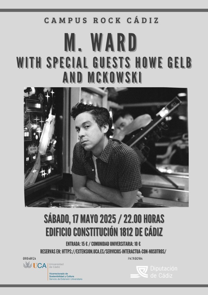 El músico norteamericano M. Ward, acompañado por Howe Gelb y McKowski, protagonizarán una nueva cita del ciclo Campus Rock Cádiz el sábado 17 de mayo de 2025 a las 22.00 horas en el Edificio Constitución 1812 de Cádiz. El acto está organizado por el Servicio de Extensión Universitaria del Vicerrectorado de Sostenibilidad y Cultura de la Universidad de Cádiz y cuenta con el patrocinio de la Diputación Provincial de Cádiz.