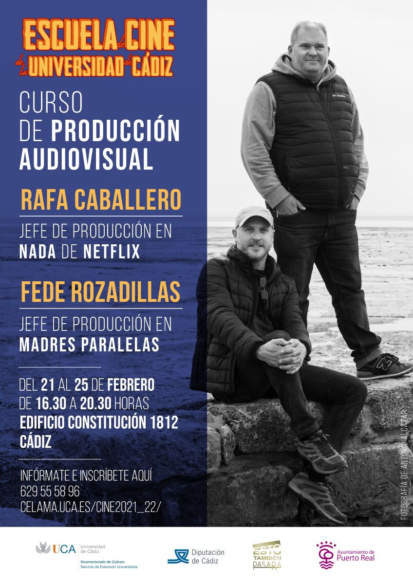 Del 21 al 25 de febrero de 2022, en horario de 16.30 a 20.30 horas, tendrá lugar en la Sala Palafox del Edificio Constitución 1812 de Cádiz, el curso Producción Audiovisual. “De la Idea a la Obra”, impartido por Fede Rozadillas y Rafa Caballero. La propuesta formativa está incluida en el programa de la Escuela de Cine de la Universidad de Cádiz, organizada por el Servicio de Extensión Universitaria del Vicerrectorado de Cultura y bajo la coordinación técnica de Bruto Pomeroy.