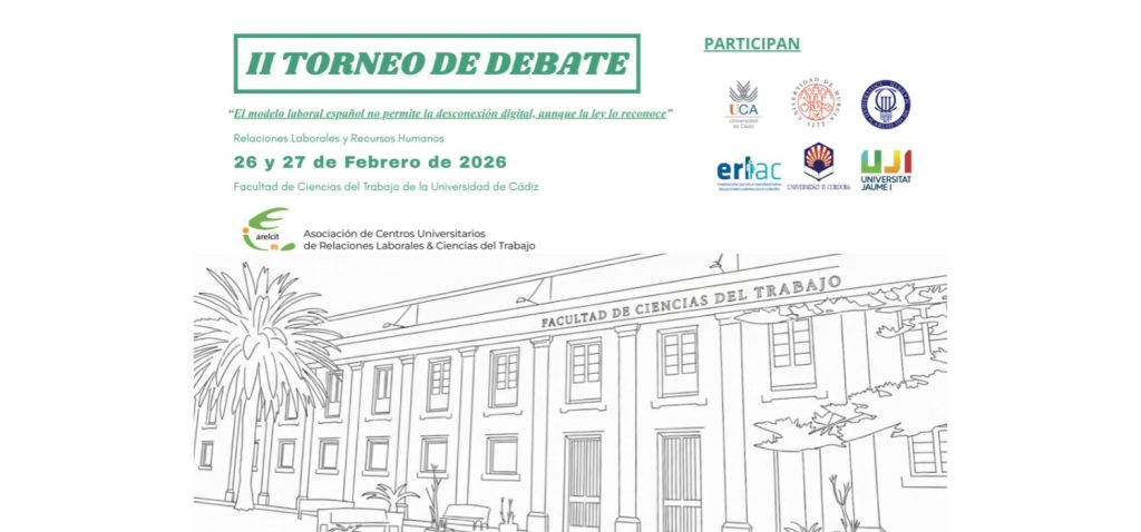 La Facultad de Ciencias del Trabajo del Campus de Cádiz organiza el II Torneo de Debate: El modelo laboral español no permite la desconexión digital, aunque la ley lo reconoce. Dicho campeonato entre estudiantes universitarios de los Grados de Relaciones Laborales y Recursos Humanos y Derecho, tiene por objeto contribuir al desarrollo de competencias de los grados, al fomento del debate y la oratoria, la discusión de las ideas y confrontación de argumentos, bajo la mirada de la libertad de expresión y respeto. Al mismo tiempo se fomenta un espacio de diálogo universitario a nivel nacional.
