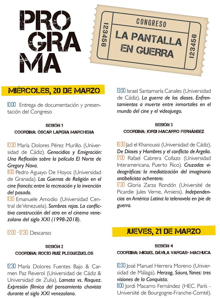 El IV Congreso de Cine y Humanidades “LA PANTALLA EN GUERRA” tendrá lugar los días 20, 21 y 22 de marzo de 2019 en el salón de grados de la Facultad de Filosofía y Letras de la Universidad de Cádiz. Se trata de la primera actividad oficial organizada por el Grupo de investigación “Imagen y Memoria: miradas transversales entre la Historia y los Medios Audiovisuales” (HUM-1026, Universidad de Cádiz).