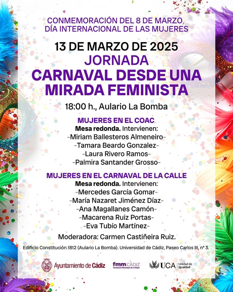 Os invitamos a participar en la Jornada “CARNAVAL DESDE UNA MIRADA FEMINISTA” organizada por la Unidad de Igualdad junto a la Fundación Municipal de la Mujer del Ayuntamiento de Cádiz. Se compondrá de dos mesas redondas (MUJERES EN EL COAC y MUJERES EN EL CARNAVAL DE LA CALLE) en las que intervendrán reconocidas personalidades del carnaval gaditano (autoras, directoras, componentes e investigadoras), pertenecientes tanto a las agrupaciones que participan en el COAC como a las relacionadas con el carnaval callejero.