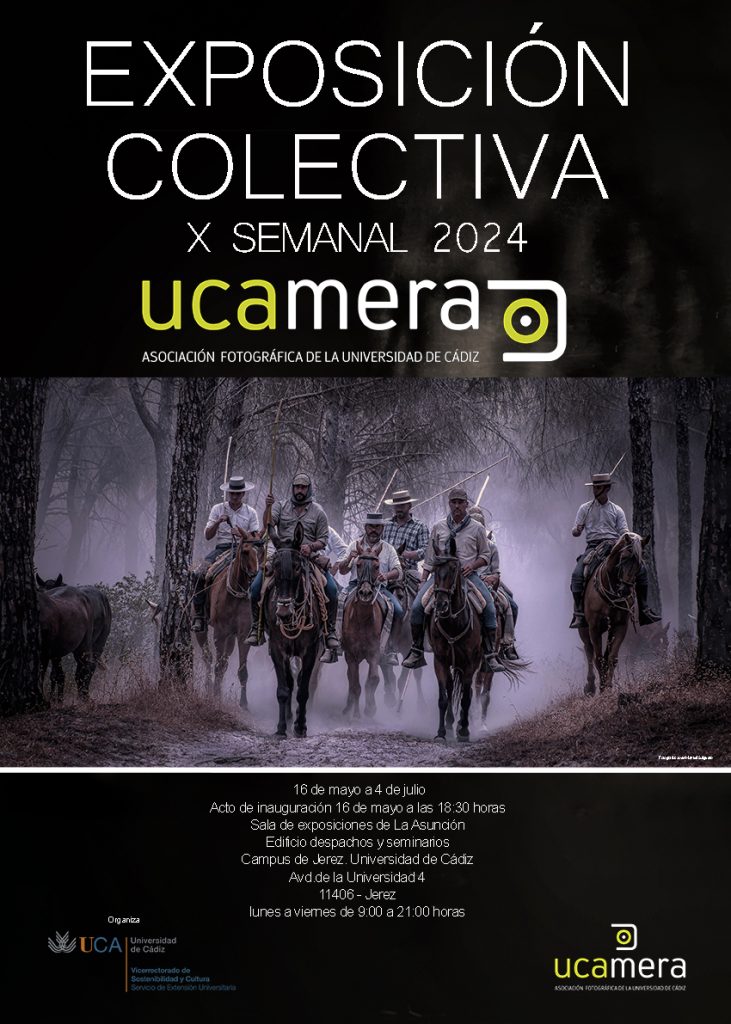 El servicio de Extensión Universitaria del Vicerrectorado de Sostenibilidad y Cultura de la Universidad de Cádiz organiza, en colaboración con la asociación fotográfica de la UCA, la exposición fotográfica colectiva X Semanal 2024 de UCAMERA en la sala de exposiciones del Campus de la Asunción de Jerez. La muestra podrá visitarse, de lunes a viernes y de 9 a 21 horas, desde el 16 de mayo hasta el 4 de julio en el edificio Despachos y Seminarios del Campus de Jerez.