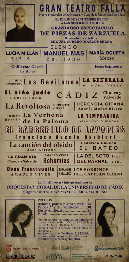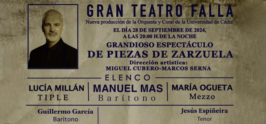 La Orquesta y la Coral de la Universidad de Cádiz celebran el próximo sábado 28 de septiembre, a las 20 horas en el Gran Teatro Falla de Cádiz, el concierto “Zarzuela&Cia II”. Este concierto forma parte de las producciones del servicio de Extensión Universitaria del Vicerrectorado de Sostenibilidad y Cultura de la Universidad de Cádiz y cuenta con la colaboración del Consejo Social de la Universidad de Cádiz, el Ayuntamiento de Cádiz, el Gran Teatro Falla, el Diario de Cádiz y JM Cádiz.