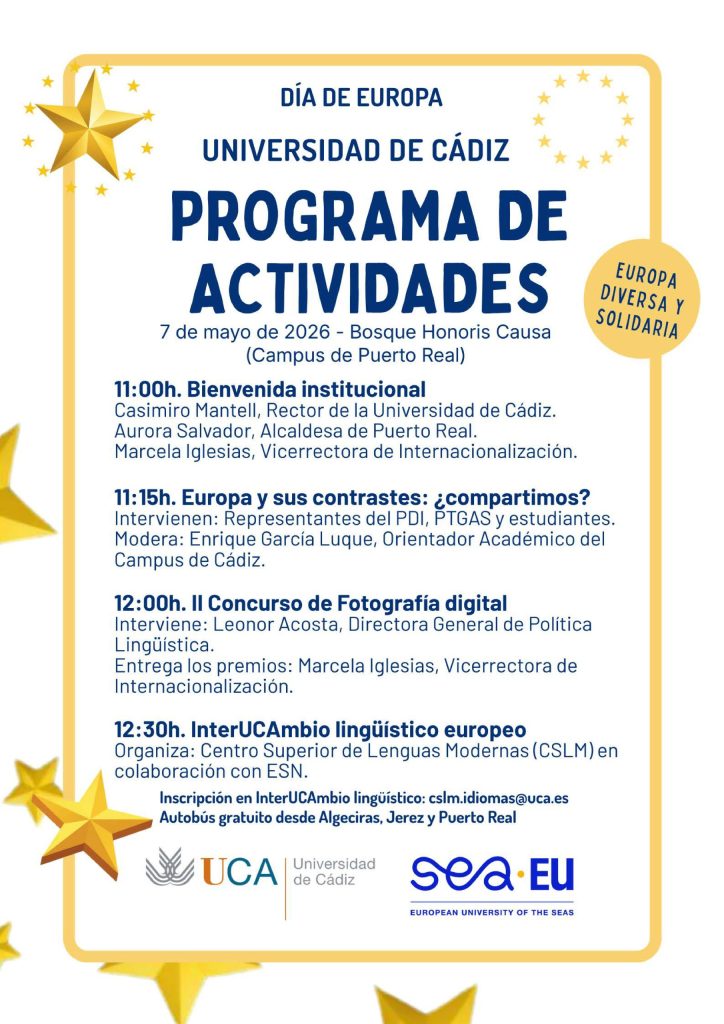 El Bosque Honoris Causa del Campus de Puerto Real acogerá el próximo 7 de mayo la celebración del Día de Europa con un programa que incluirá una bienvenida institucional a cargo del rector de la Universidad de Cádiz, la alcaldesa de Puerto Real y la vicerrectora de Internacionalización, seguida de una puesta en común bajo el título Europa y sus contrastes: ¿Compartimos?, en la que participarán representantes del PDI, PTGAS y estudiantado. La jornada continuará con la entrega de premios del II Concurso de Fotografía Digital, presentada por la directora general de Política Lingüística y con la participación de la vicerrectora de Internacionalización, y concluirá con la actividad InterUCAmbio lingüístico, organizada por el CSLM en colaboración con ESN.