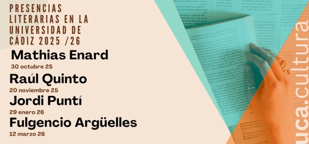 El servicio de Extensión Universitaria del Vicerrectorado de Sostenibilidad y Cultura de la Universidad de Cádiz organiza las próximas citas del veterano ciclo Presencias Literarias en la Universidad de Cádiz para el curso 2025-2026 con los escritores Mathias Enard, Raúl Quinto, Jordí Puntí y Fulgencio Argüelles. Las actividades, que cuentan con la colaboración de la Librería Manuel de Falla, se desarrollarán en el edificio Constitución 1812. La entrada será libre hasta completar aforo.