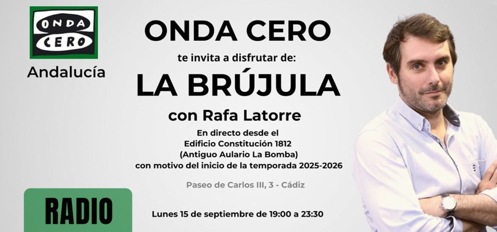 El próximo 15 de septiembre, de 19:00 a 23:30 horas, el Edificio Constitución 1812 acoge la retransmisión en directo La Brújula , el popular programa de Onda Cero, con Rafa Latorre, con motivo del inicio de la temporada 2025-2026.