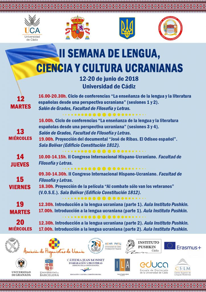 12-13 junio: Ciclo de Conferencias “La enseñanza de la lengua y literatura ucranianas desde una perspectiva ucraniana”: https://posgrado.uca.es/web/short/cursodoc.php?idcurso=329 (impartido por especialistas ucranianos de Kiev, Odesa y Nikolaev)