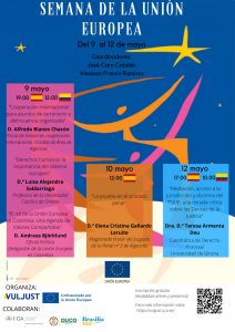 Del 9 al 12 de mayo contaremos con una interesante programación en el marco de la Semana de la Unión Europea con ponentes como Alfredo Blanes Chacón, Fiscal de Enlace en cooperación internacional, o Teresa Armenta Deu, Catedrática de Derecho Procesal de la Universidad de Girona, entre otros.