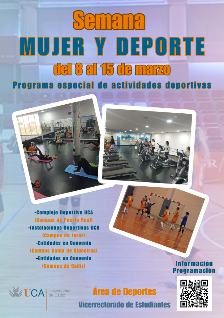 La programación por campus de la Semana Mujer y Deporte, a la que podrían añadirse nuevas acciones, y la información sobre inscripciones y participación se pueden consultar en la web: https://areadeportes.uca.es/mujerydeporte/
