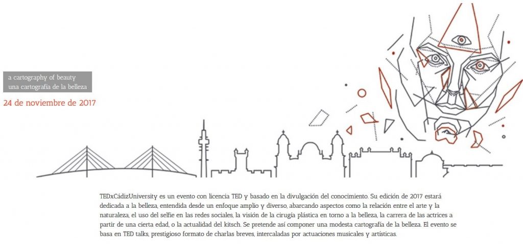 TEDxCádizUniversity es un evento con licencia TED y basado en la divulgación del conocimiento. Su edición de 2017 estará dedicada a la belleza, entendida desde un enfoque amplio y diverso, abarcando aspectos como la relación entre el arte y la naturaleza, el uso del selfie en las redes sociales, la visión de la cirugía plástica en torno a la belleza, la carrera de las actrices a partir de una cierta edad, o la actualidad del kitsch. Se pretende así componer una modesta cartografía de la belleza. El evento se basa en TED talks, prestigioso formato de charlas breves, intercaladas por actuaciones musicales y artísticas