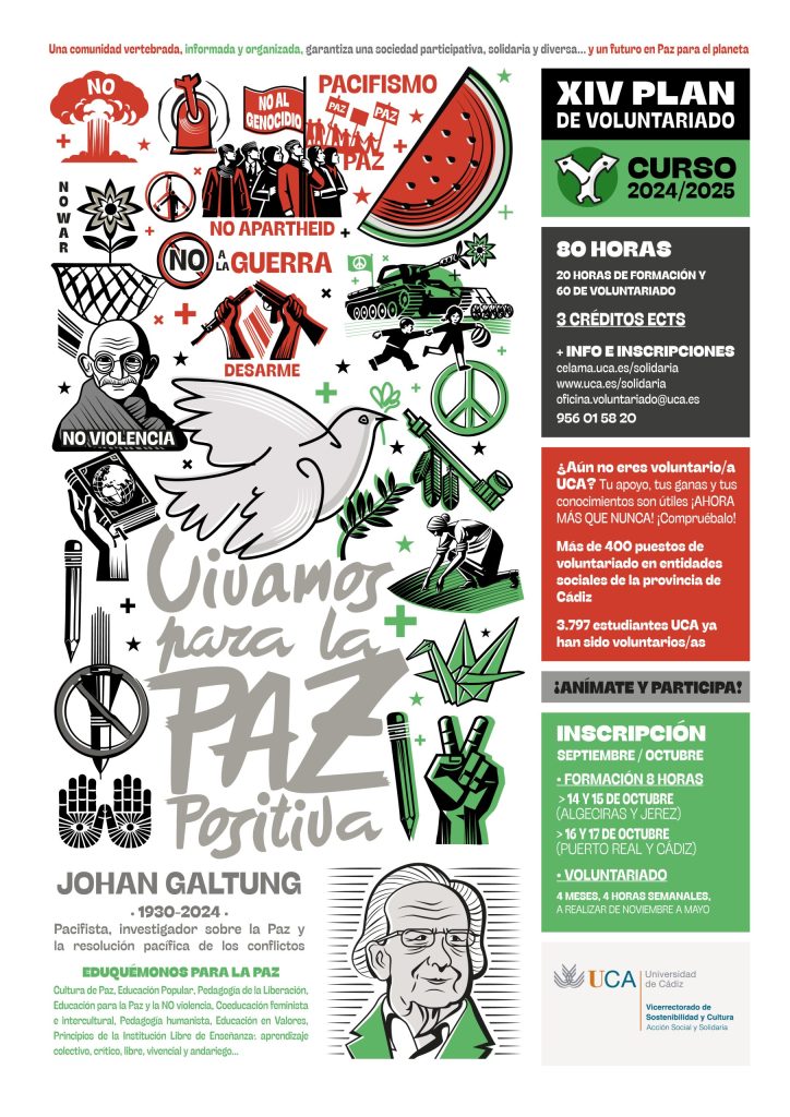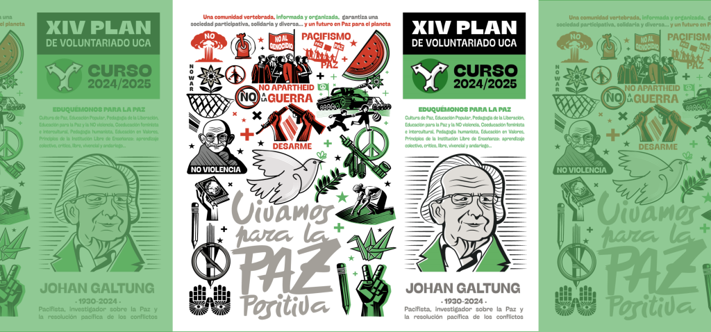 Por ello dedicamos nuestro XIV Plan de Voluntariado UCA a la Educación para la Paz, especialmente a los enfoques pedagógicos de valores humanistas y de cultura de paz positiva, capaces de generar colectivamente, espacios justos y dignos de cuidados y vida. Hacemos, también, un homenaje a los movimientos pacifistas que históricamente vienen actuando contra el genocidio, el apartheid, las guerras y todos sus terribles efectos directos o colaterales; así como abogando por el desarme, especialmente de armas nucleares y demás armamento de destrucción masiva, reclamando la reconversión de la industria armamentística y; promoviendo valores de paz y no violencia. Especialmente queremos recordar a Johan Galtung, recientemente desaparecido, reconocido pacifista, profesor e investigador sobre la Paz y la resolución pacífica de los conflictos, creador y divulgador del tan necesario concepto de Paz Positiva.