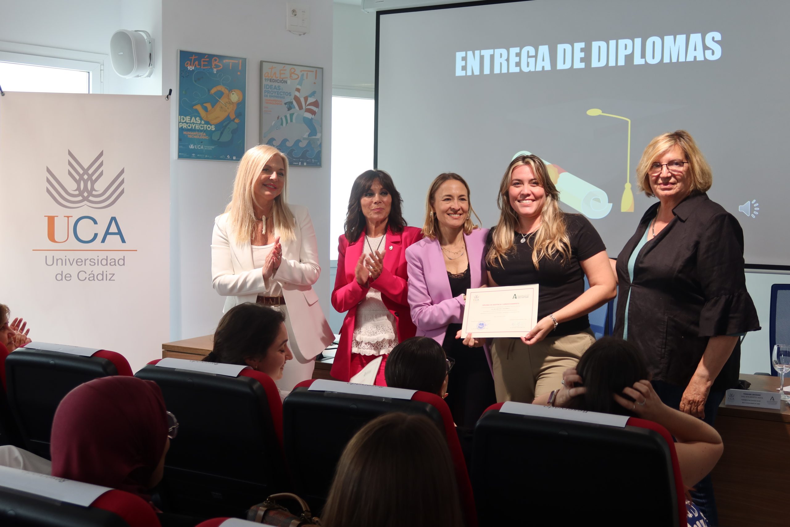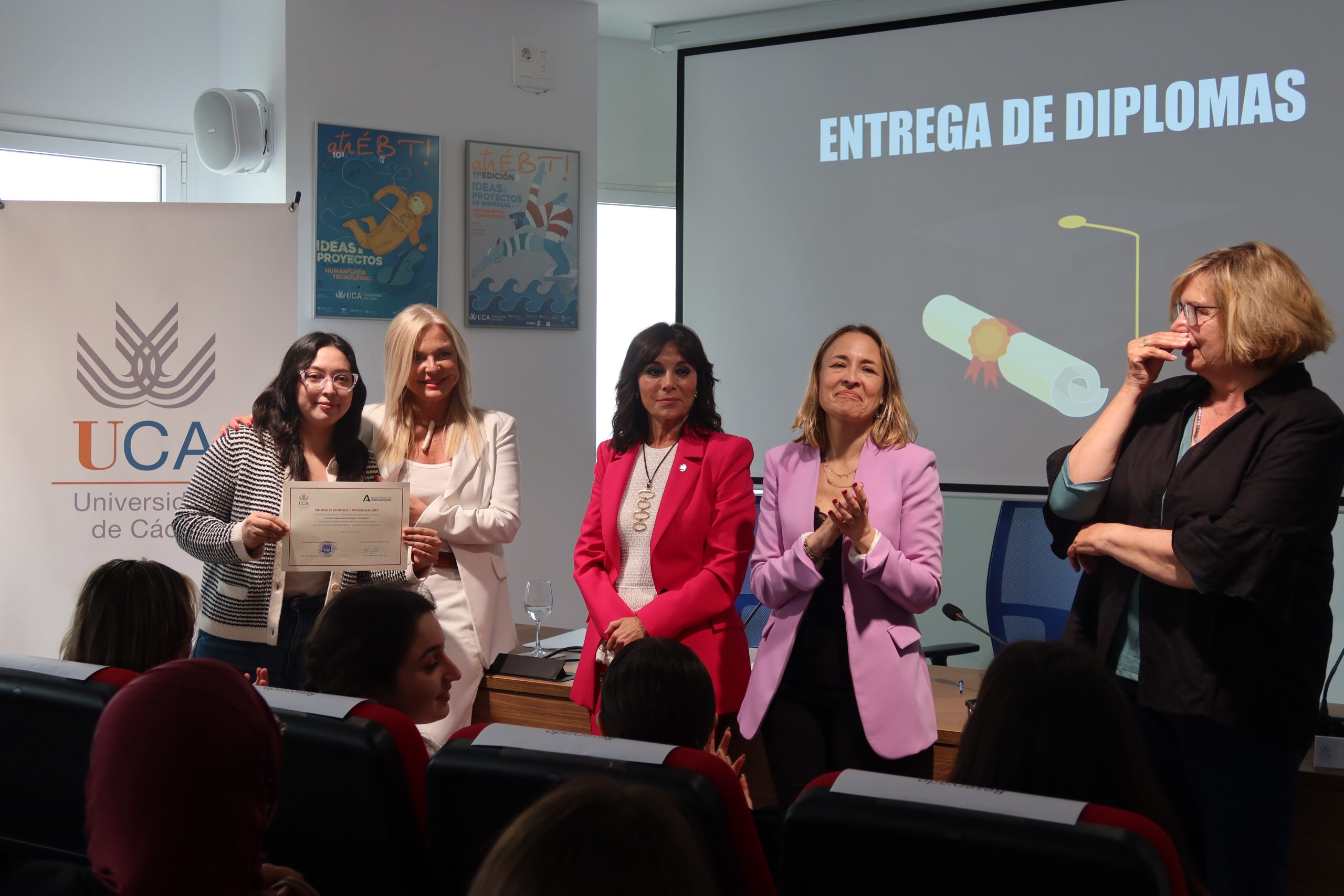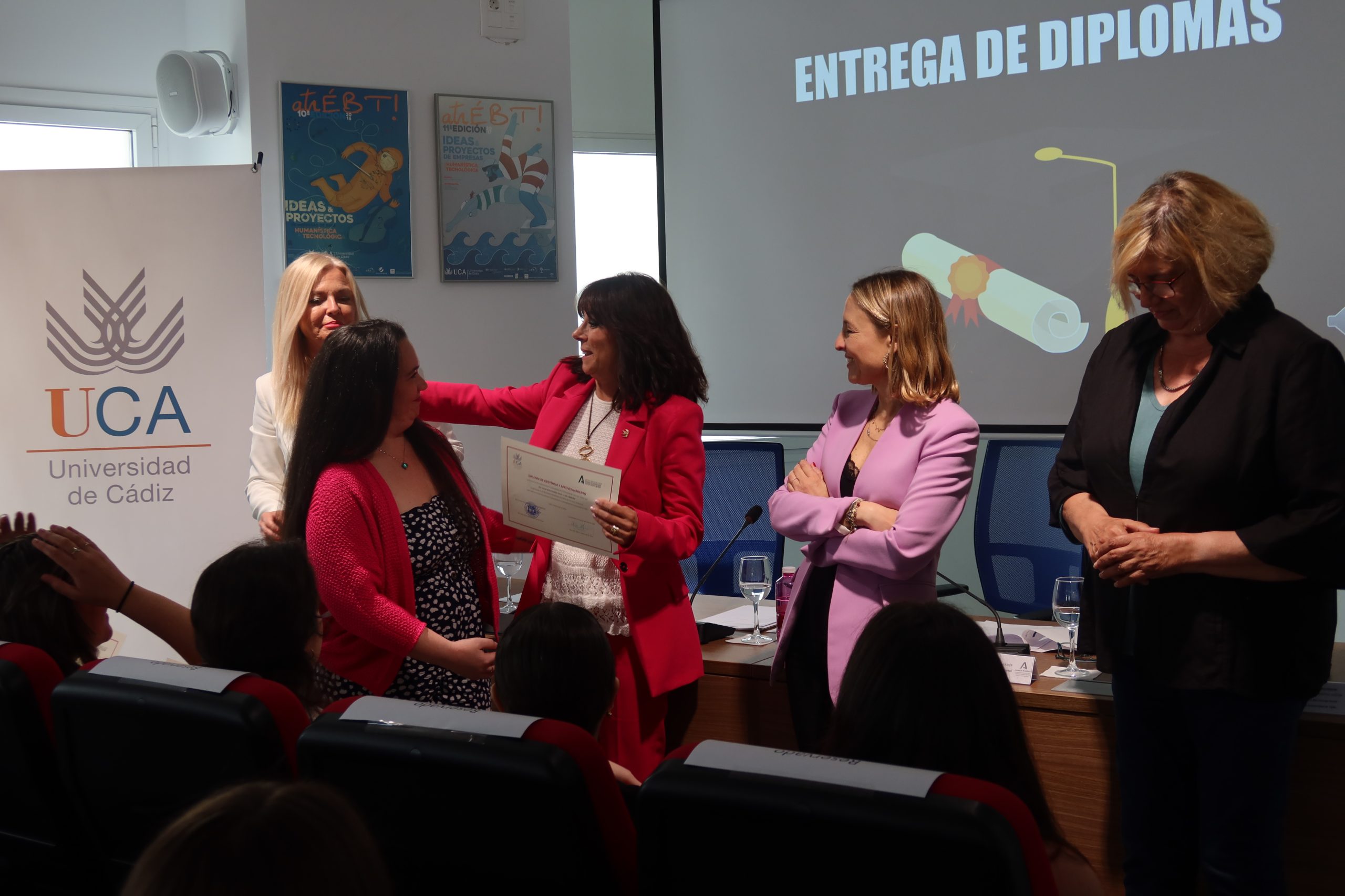 La vicerrectora de Emprendimiento y Empleabilidad de la Universidad de Cádiz, Carmen Camelo, junto a la coordinadora provincial del Instituto Andaluz de la Mujer, Blanca Merino, la consejera del Consejo Social de la UCA, Rita Benítez, y la directora General de Empleo de la UCA, Carmen Ferradans, ha presidido hoy, en el salón de Actos del Centro de Transferencia Empresarial El Olivillo del Campus de Cádiz, el acto de clausura del programa Univergem 2023/2024: Universidades por la empleabilidad y el emprendimiento de las mujeres universitarias desde la perspectiva de género.