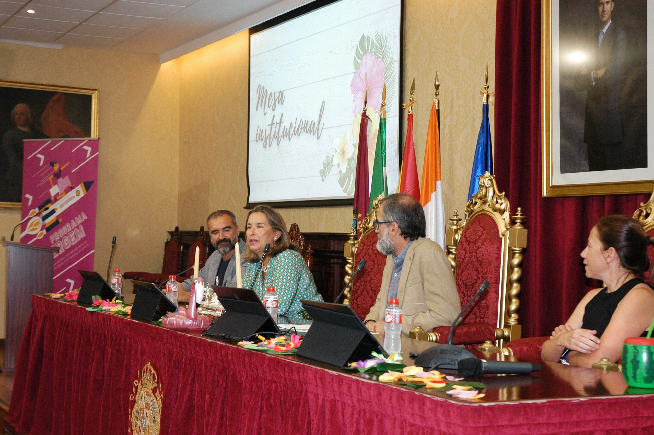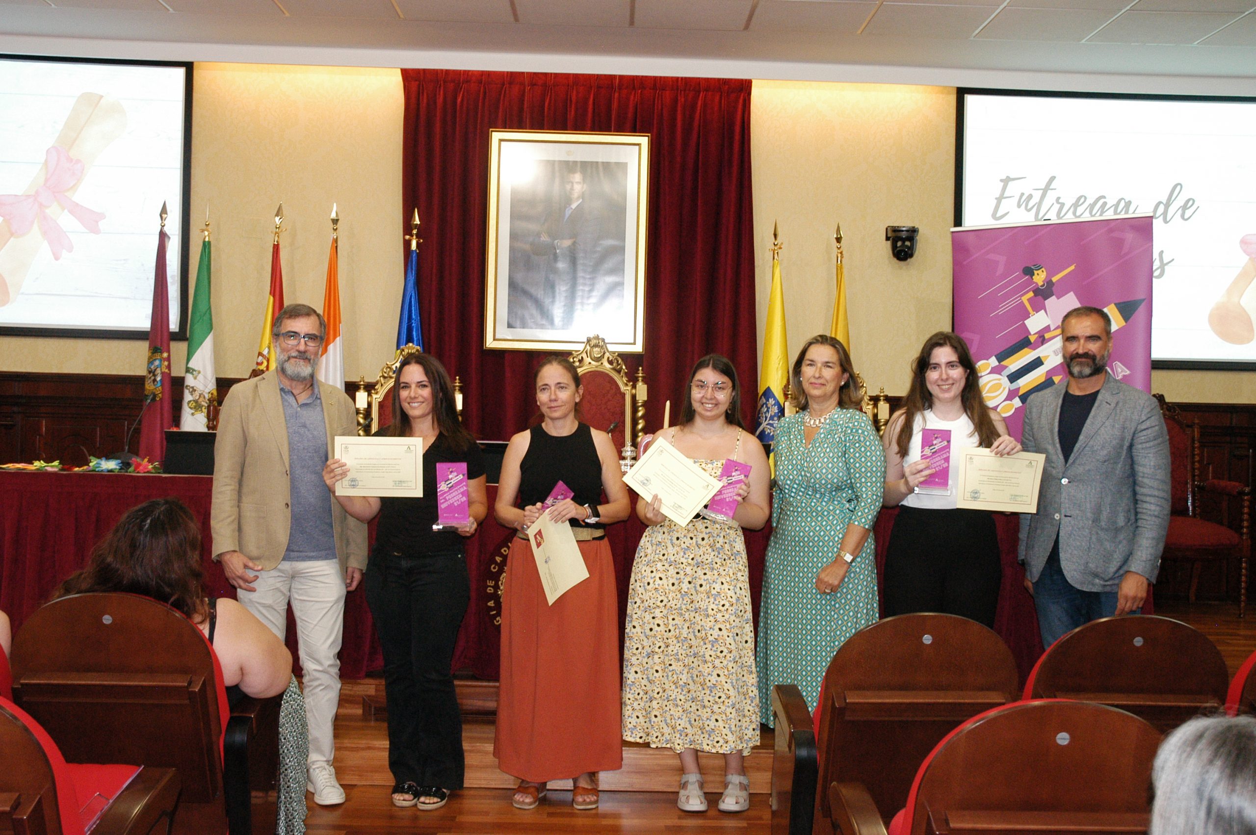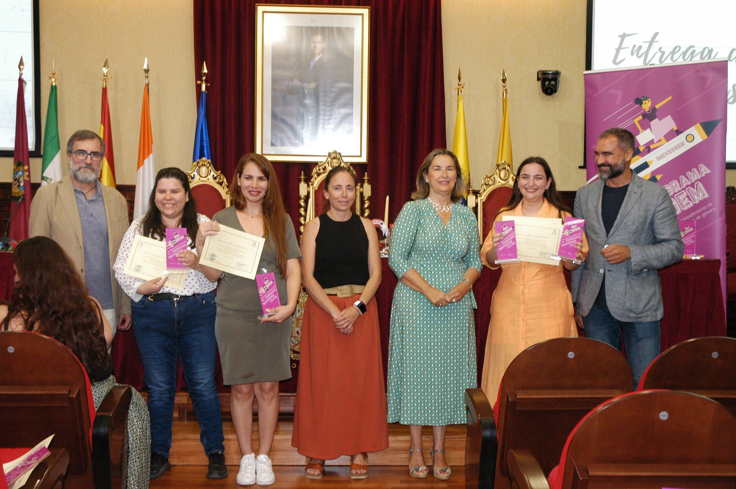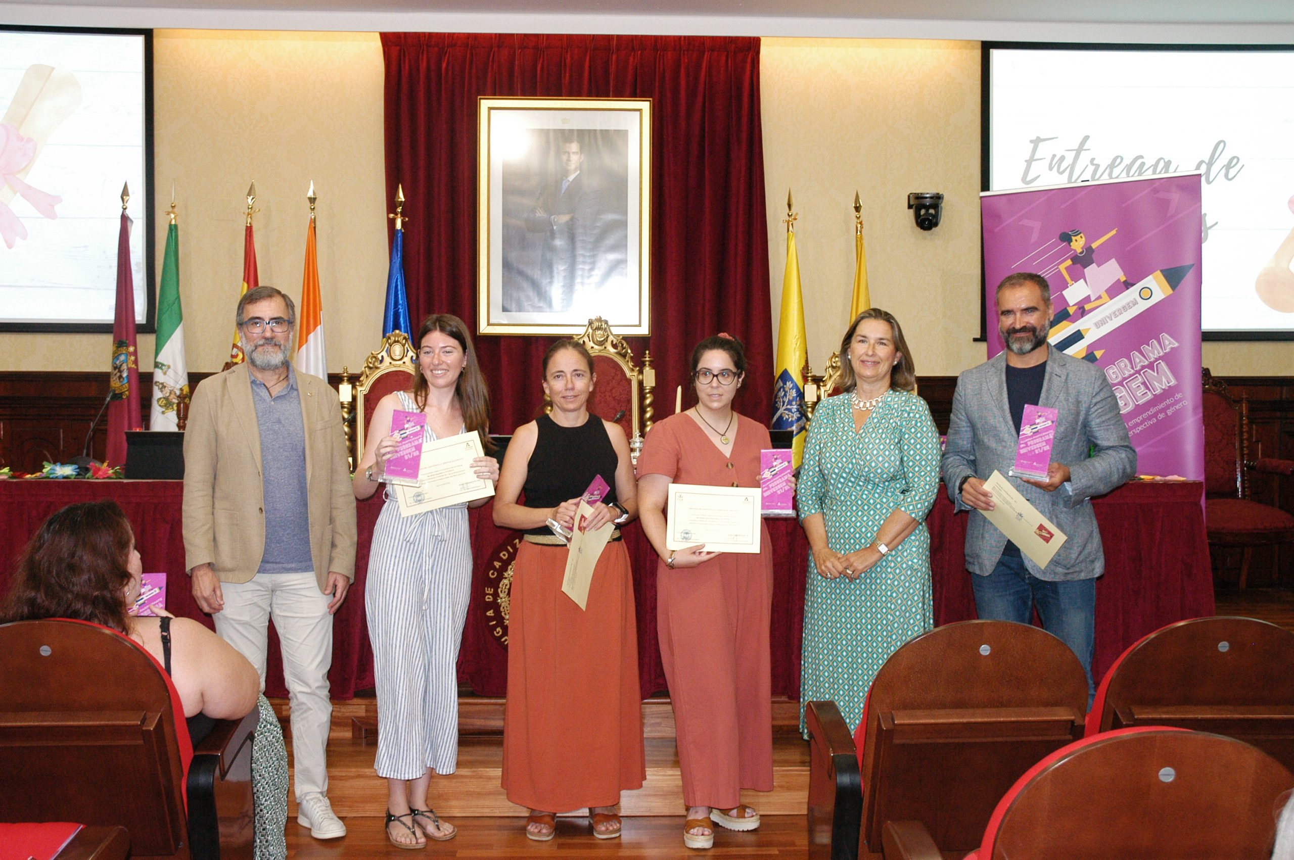 El vicerrector de Estudiantes y Empleo de la UCA, Manuel Sánchez, en compañía de la asesora de Programas del IAM en Cádiz, Celia Mañueco, la delegada del Rector para las Políticas de Igualdad e Inclusión de la UCA, Maika García, y el director del Centro de Promoción de Empleo y Prácticas de la UCA, Luis López, han presidido hoy el acto, conducido por Cadigenia, de entrega de los certificados de aprovechamiento a sus participantes, así como de las placas conmemorativas a las empresas/entidades participantes.