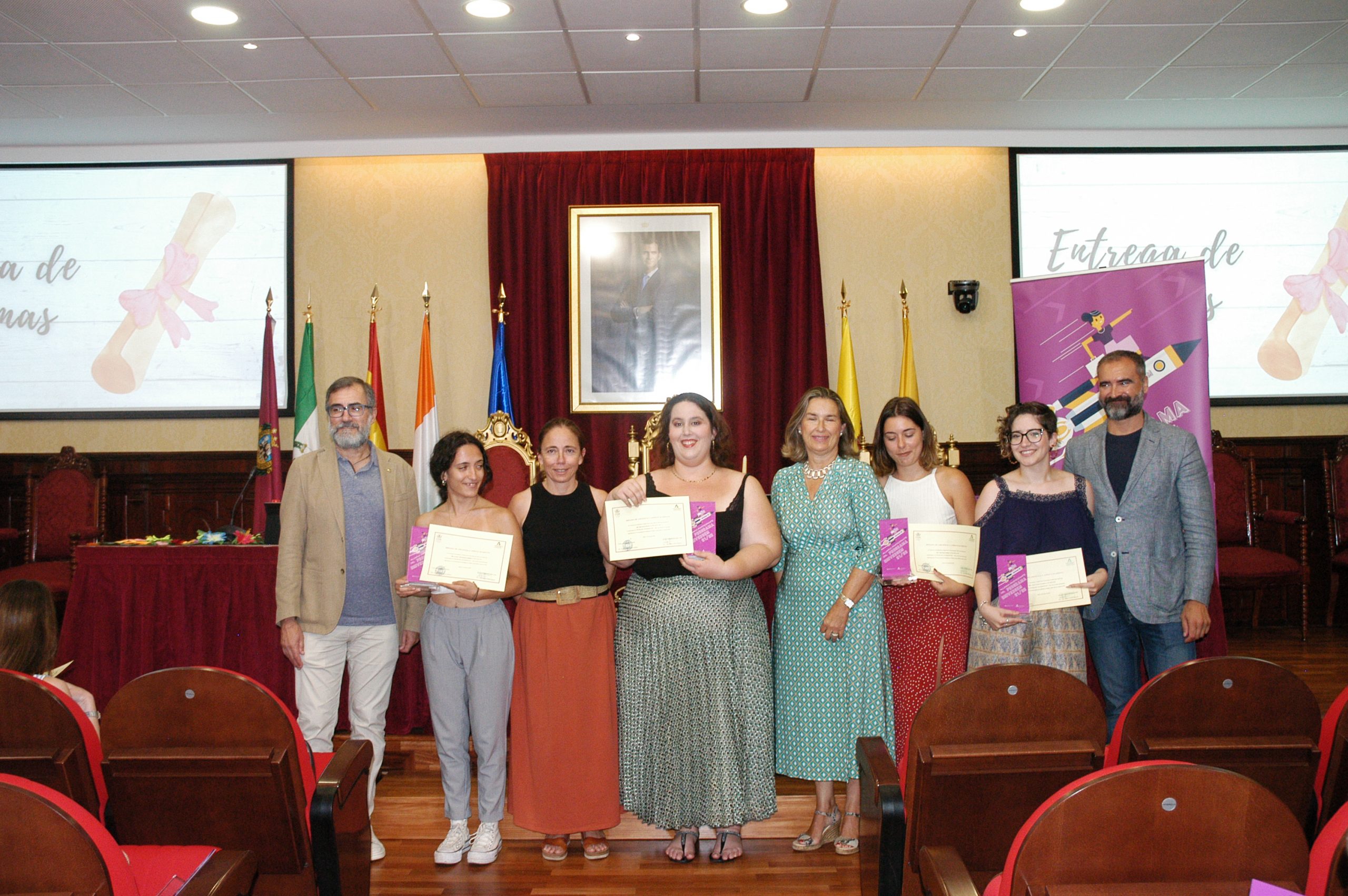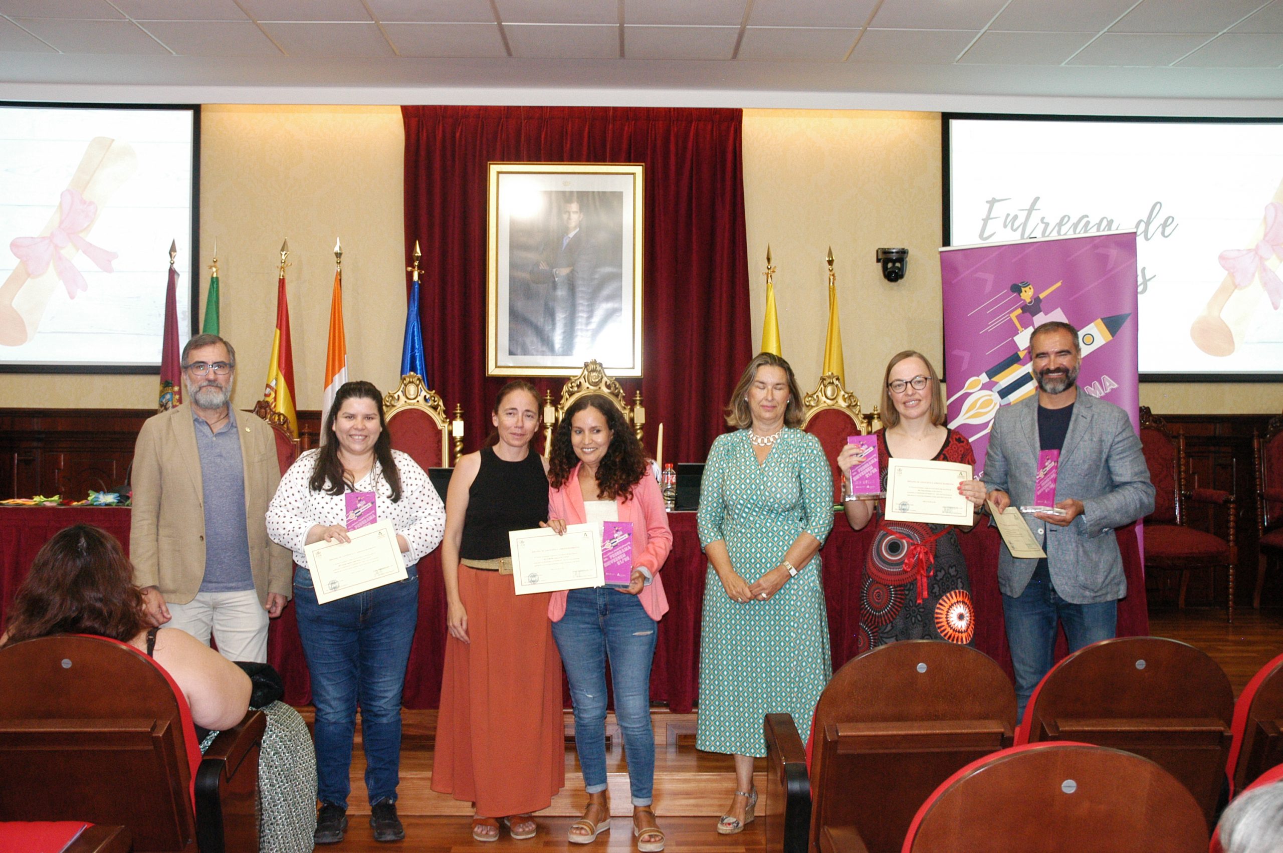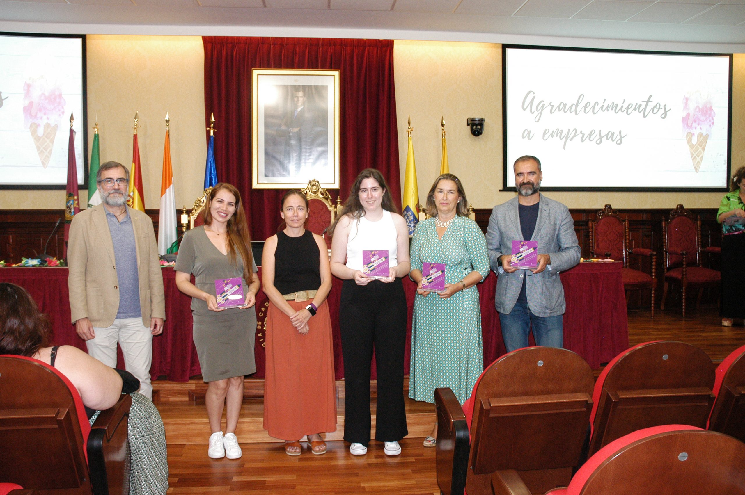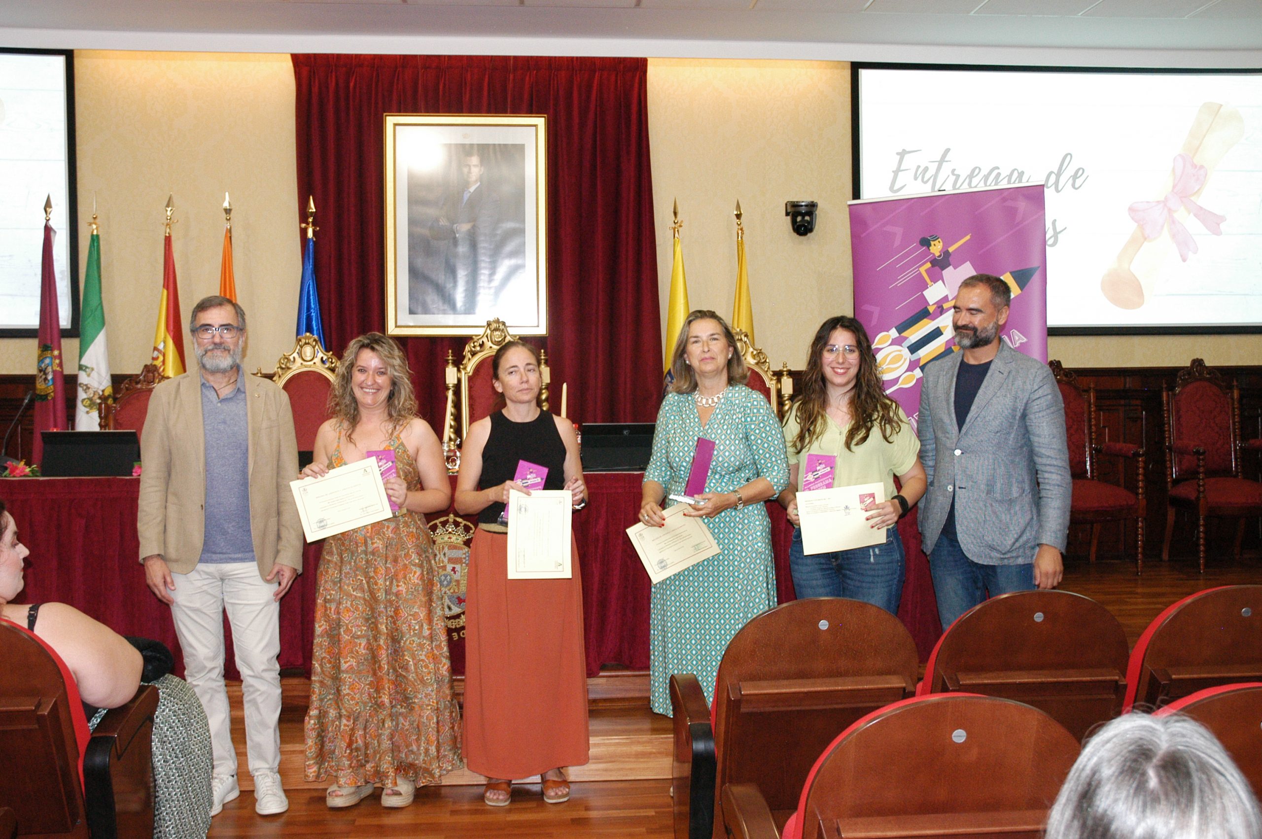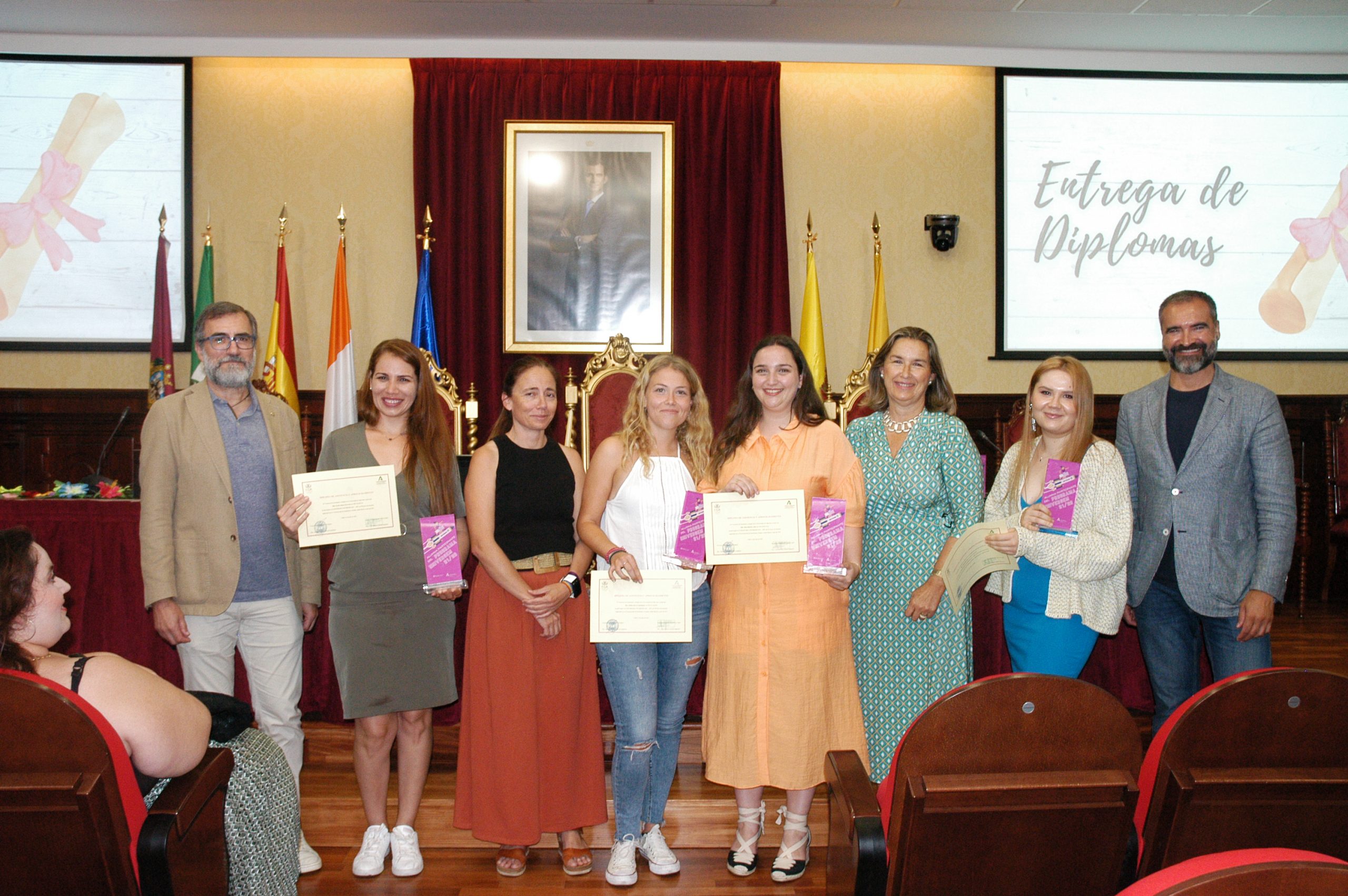 El vicerrector de Estudiantes y Empleo de la UCA, Manuel Sánchez, en compañía de la asesora de Programas del IAM en Cádiz, Celia Mañueco, la delegada del Rector para las Políticas de Igualdad e Inclusión de la UCA, Maika García, y el director del Centro de Promoción de Empleo y Prácticas de la UCA, Luis López, han presidido hoy el acto, conducido por Cadigenia, de entrega de los certificados de aprovechamiento a sus participantes, así como de las placas conmemorativas a las empresas/entidades participantes.