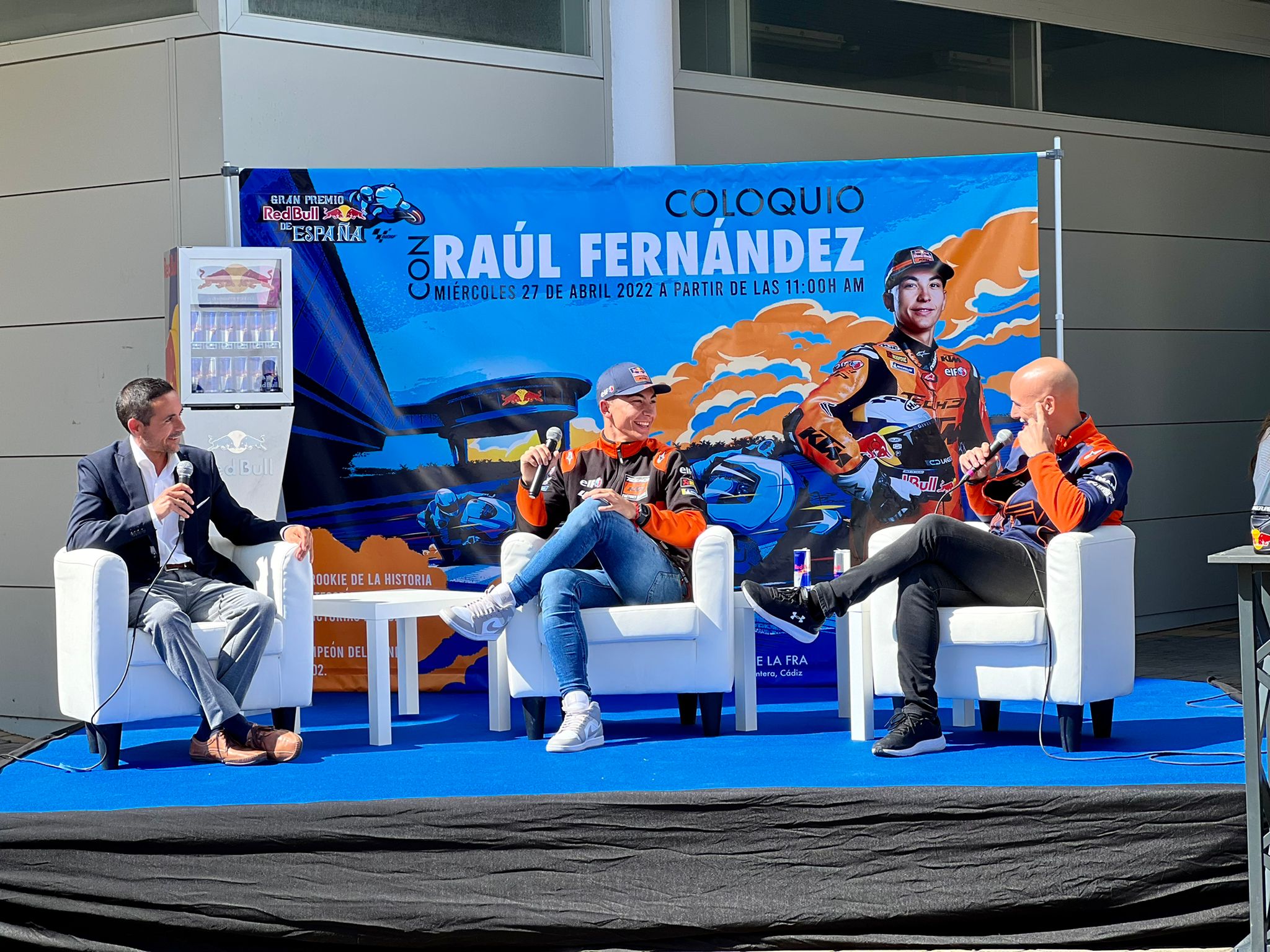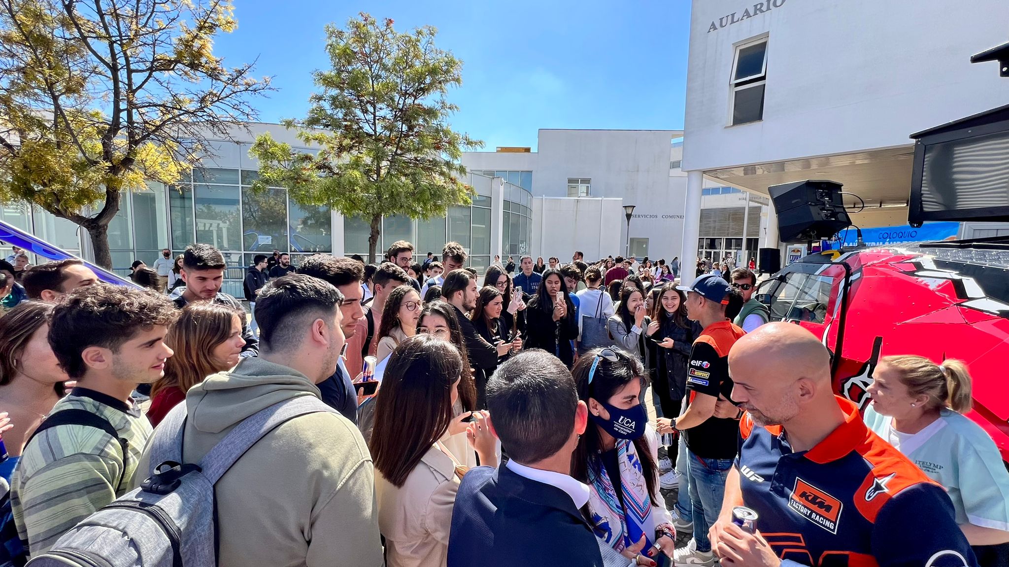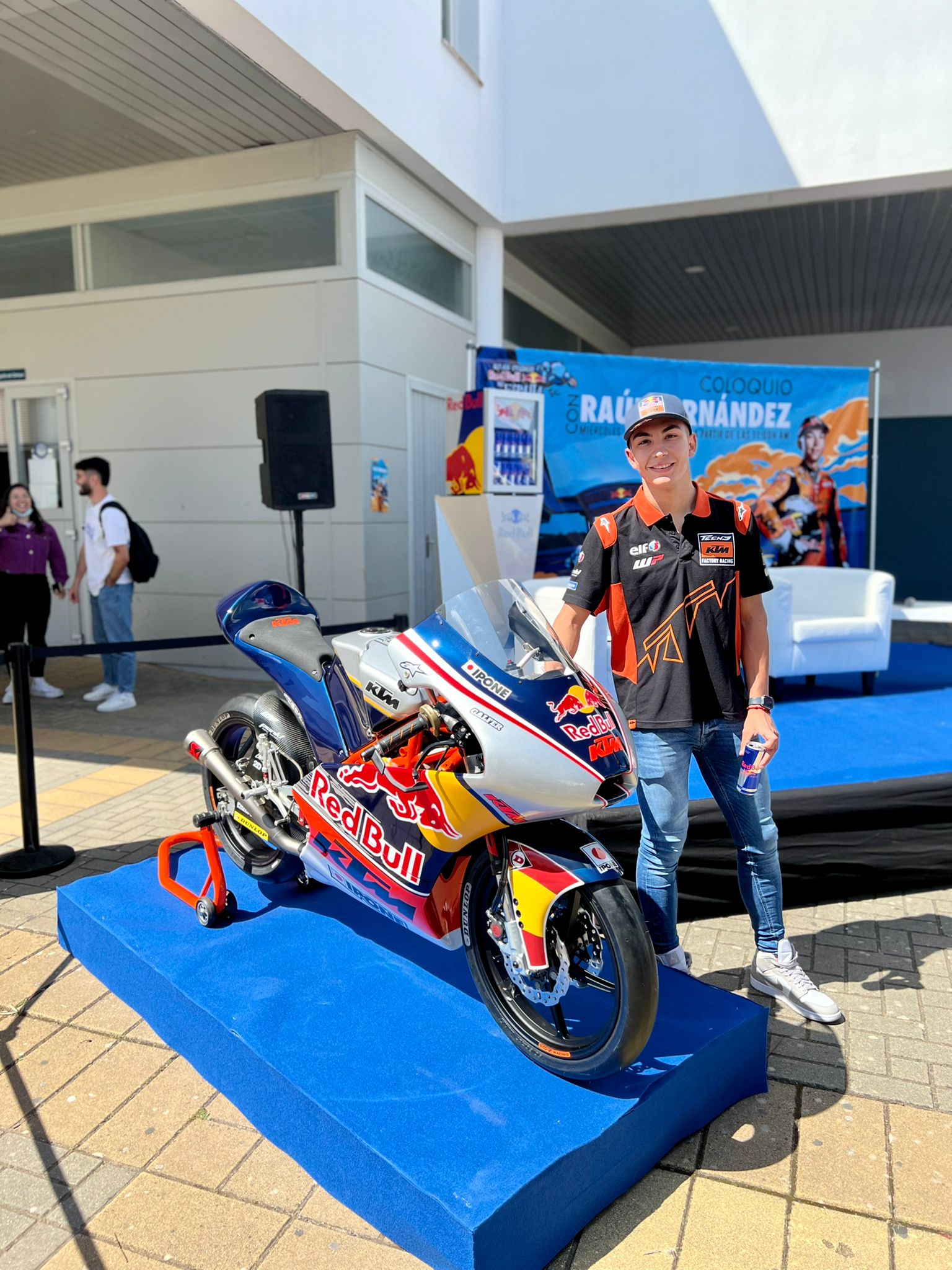 Con motivo del campeonato de Motociclismo, con el patrocinio de Red Bull, el Campus de Jerez ha acogido hoy, con un gran éxito de público, un coloquio con el subcampeón del mundo de Moto2, Raúl Fernández, piloto de KTM en la cilindrada moto GP. El acto, celebrado en el patio del edificio Multiusos, ha contado con la participación del vicerrector de Digitalización e Infraestructuras, Carlos Rioja, y del ingeniero Jefe del equipo técnico de KTM, Esteban García.