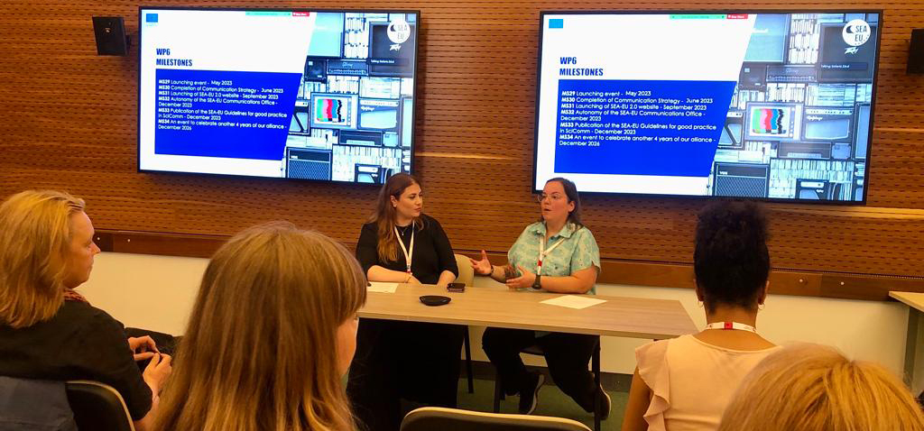 Las deliberaciones de los expertos de los paquetes de trabajo 6.1 y 6.2 sobre el diseño y la difusión de la nueva imagen SEA-EU 2.0 estuvieron dirigidas por la responsable de Comunicación del consorcio, Irene de Andrés Márquez, de la Universidad de Cádiz, que posteriormente presentó los resultados ante la Junta de Gobierno de la Alianza para someterlo a aprobación.