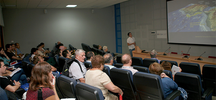 El profesor Dr. Francisco J. Sierro de la Universidad de Salamanca ha impartido la conferencia de apertura sobre Evolución paleoceanográfica del Mediterráneo: intercambios con el Atlántico. Su ponencia ha analizado la evolución del mar y los cambios climáticos en su flora y fauna desde el Pleistoceno. El investigador Sierro ha explicado que el “Mediterráneo es una máquina termodinámica, que funciona con dos motores: el agua y el calor”. Cada año debido al calor pierde por evaporación 0,7 metros de agua dulce, que gana en agua densa o salina procedente de las corrientes del Atlántico; lo que produce “una circulación termohalina” que afecta al pasado, presente y futuro de su biosfera.