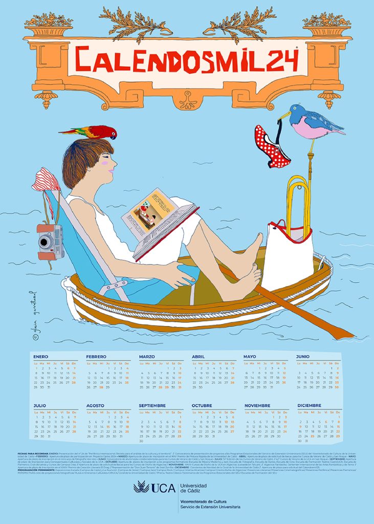 Como cada año, el Servicio de Extensión Universitaria del Vicerrectorado de Cultura de la Universidad de Cádiz ofrece gratuitamente su Calendosmil24, realizado en esta ocasión por la diseñadora e ilustradora gaditana Gloria Garrastazul. Puede solicitarse, hasta agotar existencias, en sus oficinas de los campus de Bahía de Algeciras, Cádiz y Jerez, y en las conserjerías del CASEM y la Escuela Superior de Ingeniería en el Campus de Puerto Real.