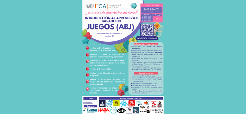 La Universidad de Cádiz, a través de la Fundación Universidad Empresa de la provincia de Cádiz (FUECA), convoca el curso ¿Te suena esta historia tan moderna? Introducción al Aprendizaje Basado en Juegos (ABJ), que se desarrollará del 9 al 12 de mayo en formato virtual. Una oferta formativa pionera en el ámbito nacional con profesorado experto en Historia, Matemáticas, Física, Didáctica y Psicología. La matrícula se puede realizar desde su web