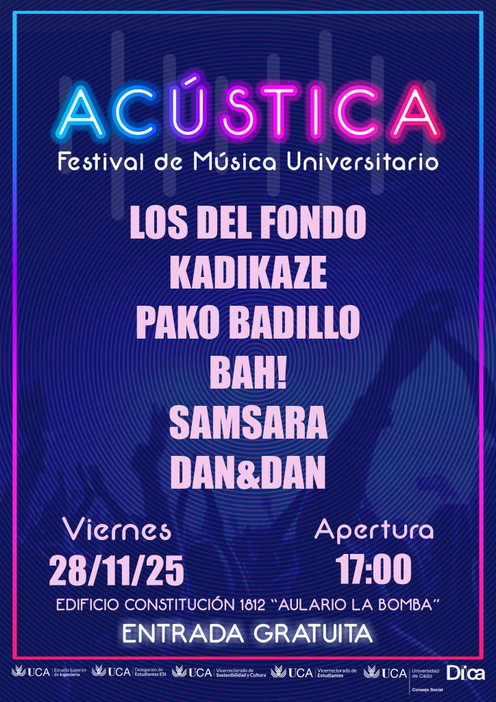 Este viernes 28 de noviembre tendrá lugar la segunda edición de Acústica: Festival de música universitario, que regresa tras el éxito obtenido en su primera edición para ofrecer una propuesta aún más grande y ambiciosa. Este evento, dirigido a la comunidad universitaria y abierto al público general, promete una jornada llena de buena música por parte de grupos de la provincia.