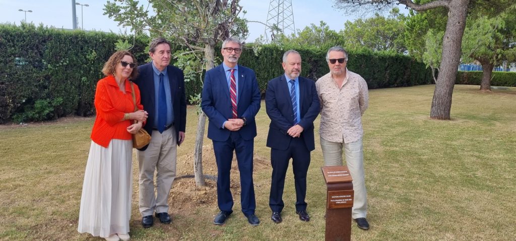 El rector de la Universidad de Cádiz, Francisco Piniella, el poeta y viudo de Almudena Grandes, Luis García Montero, el vicerrector de Cultura, José María Pérez Monguió, y familiares y amigos han descubierto esta mañana el monolito del árbol plantado en memoria de Almudena Grandes en el Bosque de los Honoris de la UCA.