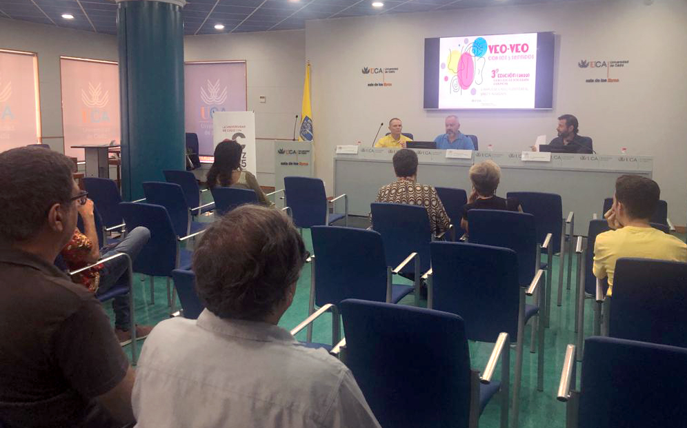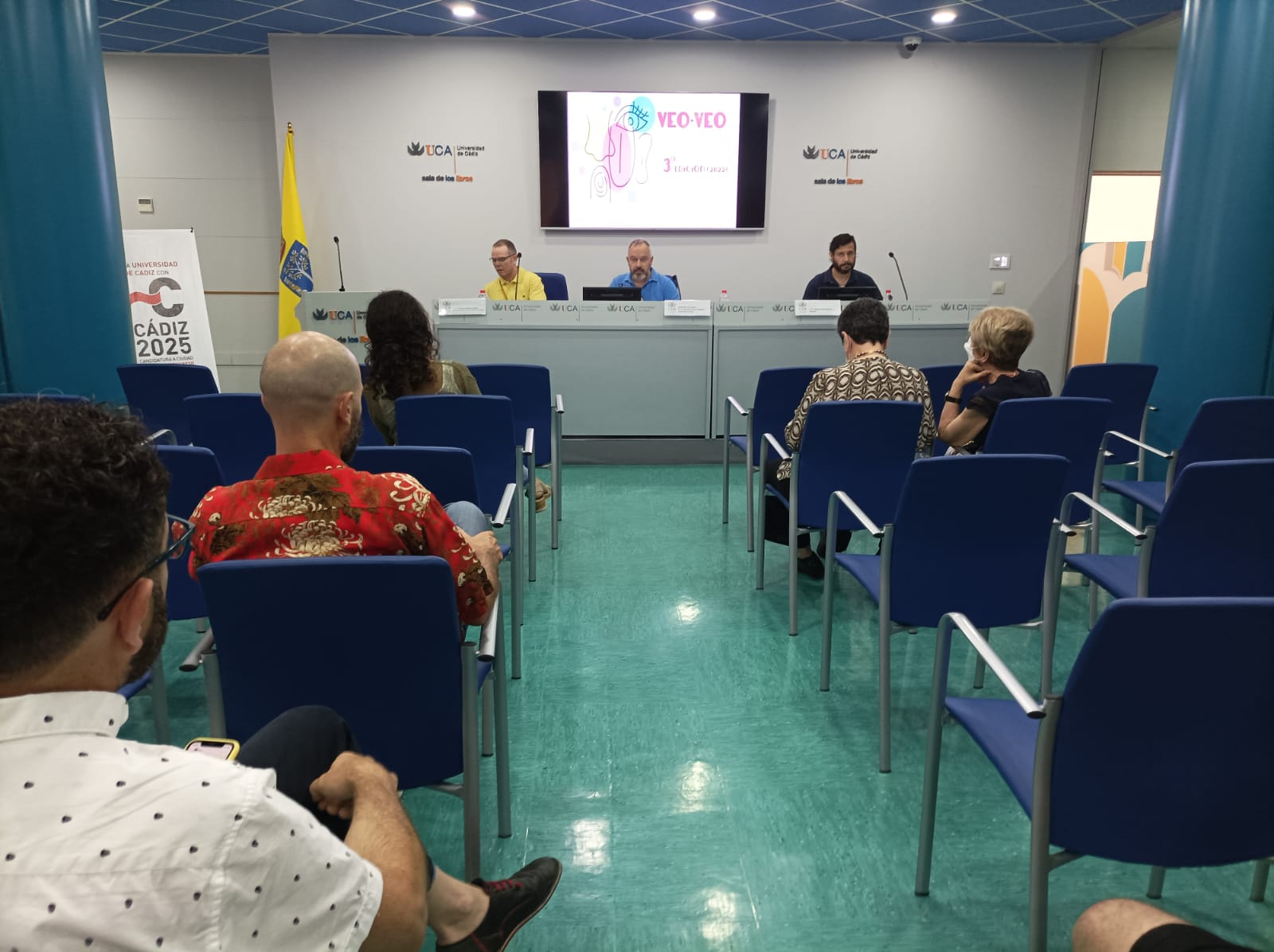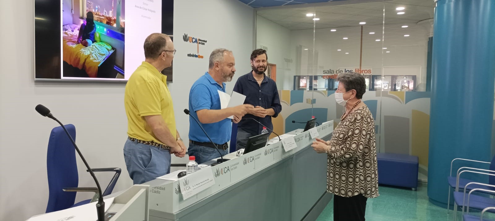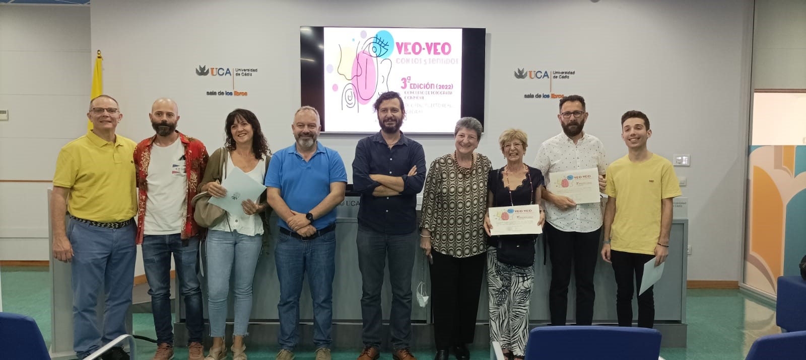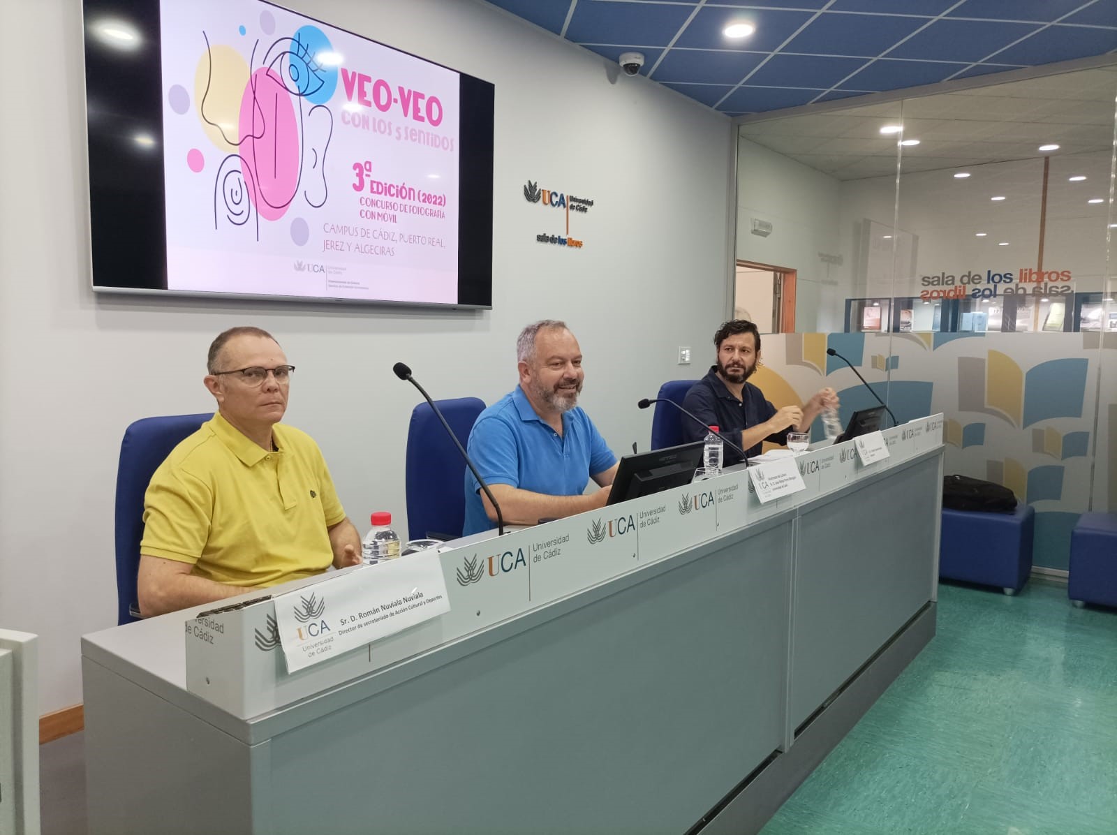 El Vicerrectorado de Cultura de la Universidad de Cádiz ha celebrado hoy, en la sala de Los Libros del edificio Andrés Segovia, la entrega de premios del concurso de fotografía Veo-Veo. Con los cinco sentidos con la presencia del vicerrector de Cultura, José María Pérez Monguió, en compañía del director de secretariado de Acción Cultural y Deportes, Román Nuviala, y del fotógrafo Daniel Casares. Un certamen impulsado por el servicio de Extensión Universitaria para reconocer las mejores imágenes tomadas con la cámara del teléfono móvil, mostrando cualquier manifestación, alusión e interpretación de nuestras percepciones sensoriales. La ganadora en 2022 ha sido la alumna Ana de Cózar Holgado por su foto titulada Sonar.