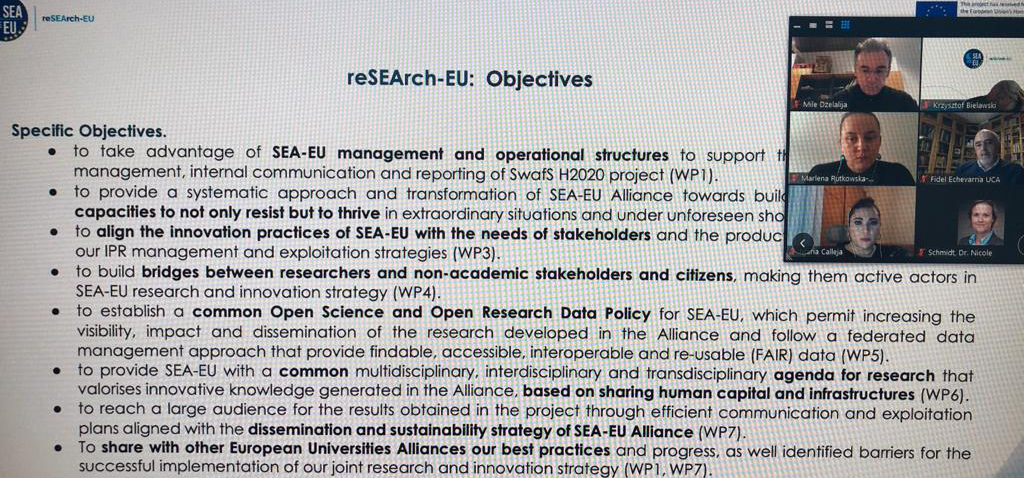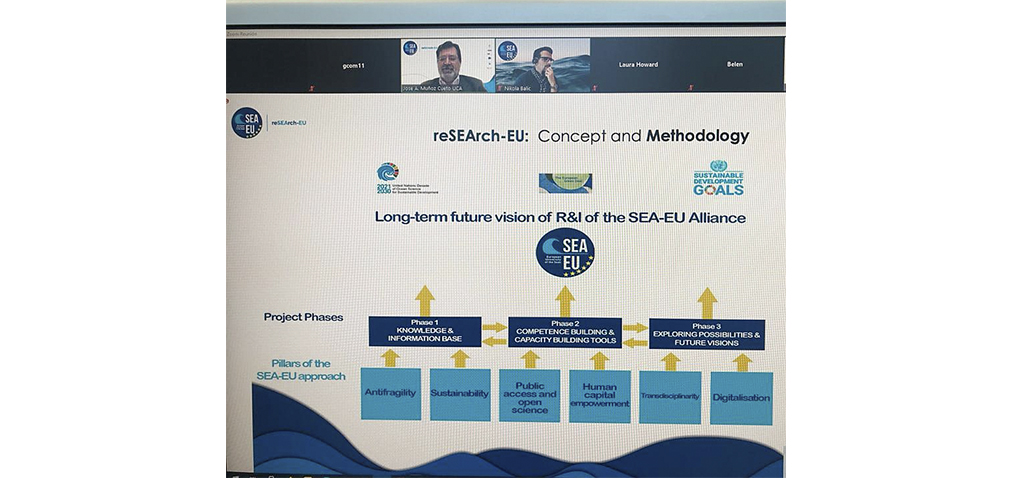La Universidad de Cádiz coordina el proyecto h2020 reSEArch-EU junto a las universidades socias del consorcio europeo Universidad Europea de los Mares (SEA-EU): Brest, Gdansk, Kiel, Malta, Split y Cádiz. En estos días, la Delegación del Rector para la Universidad Europea de los Mares de la UCA ha organizado la reunión online de arranque a este relevante proyecto que tiene un plazo de ejecución de tres años.