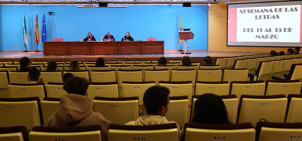 La Facultad de Filosofía y Letras de la Universidad de Cádiz ha inaugurado hoy la XI Semana de las Letras en el Campus de Cádiz, con un completo programa que oferta más de 60 actividades entre conferencias, coloquios, talleres, exposiciones, catas culinarias y visitas culturales. El decano de este centro académico, Arturo Morgado, en compañía de la vicedecana de Estudiantes y Relaciones Institucionales, Mª del Mar Barrientos, y la delegada de Alumnado de la Facultad, Lucía Fernández, han dado la bienvenida en el aula Magna a sus participantes.