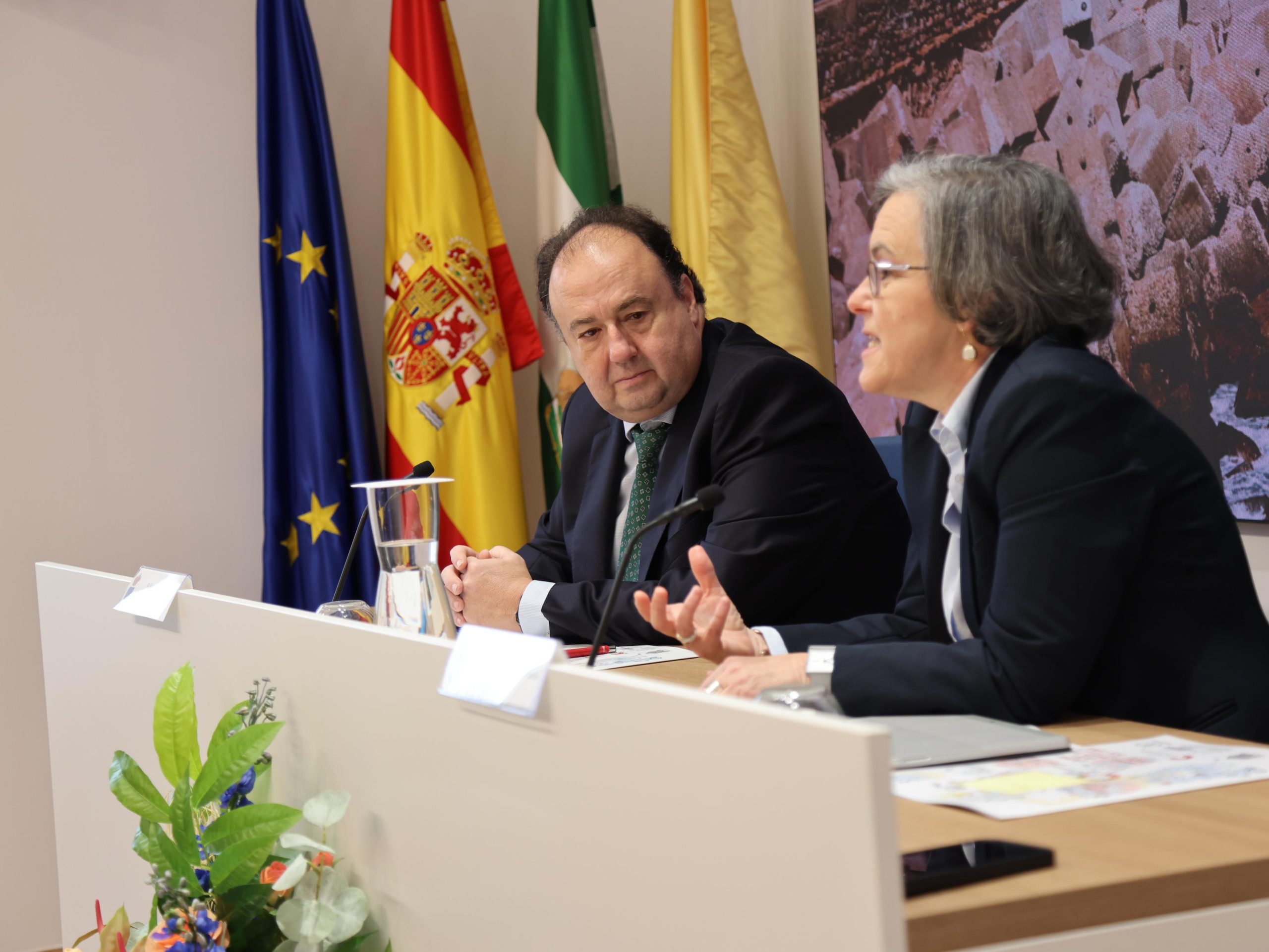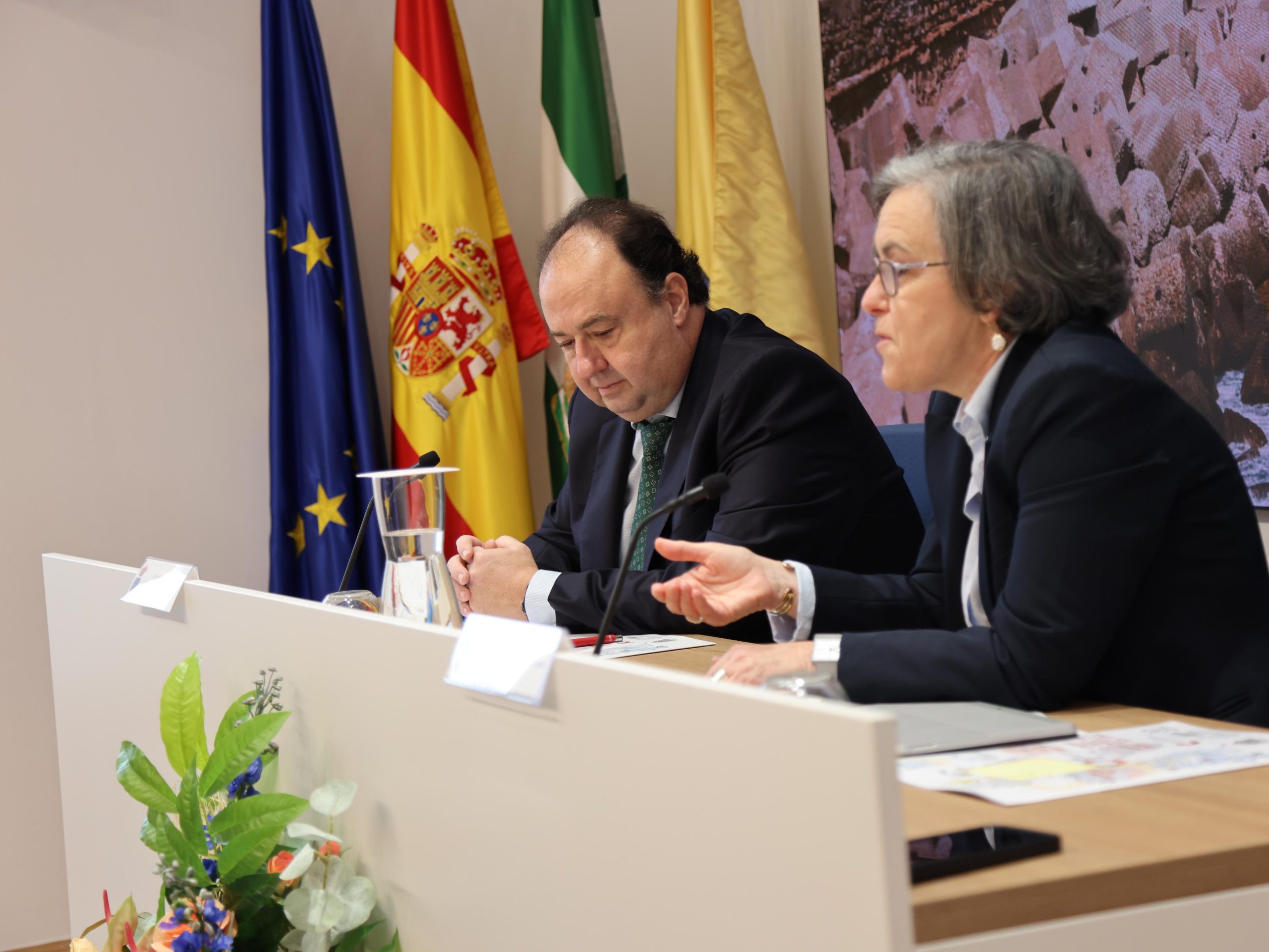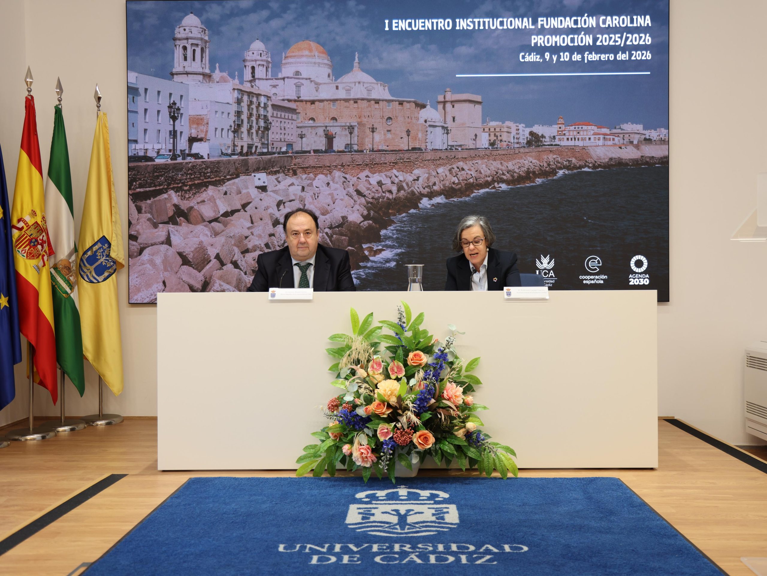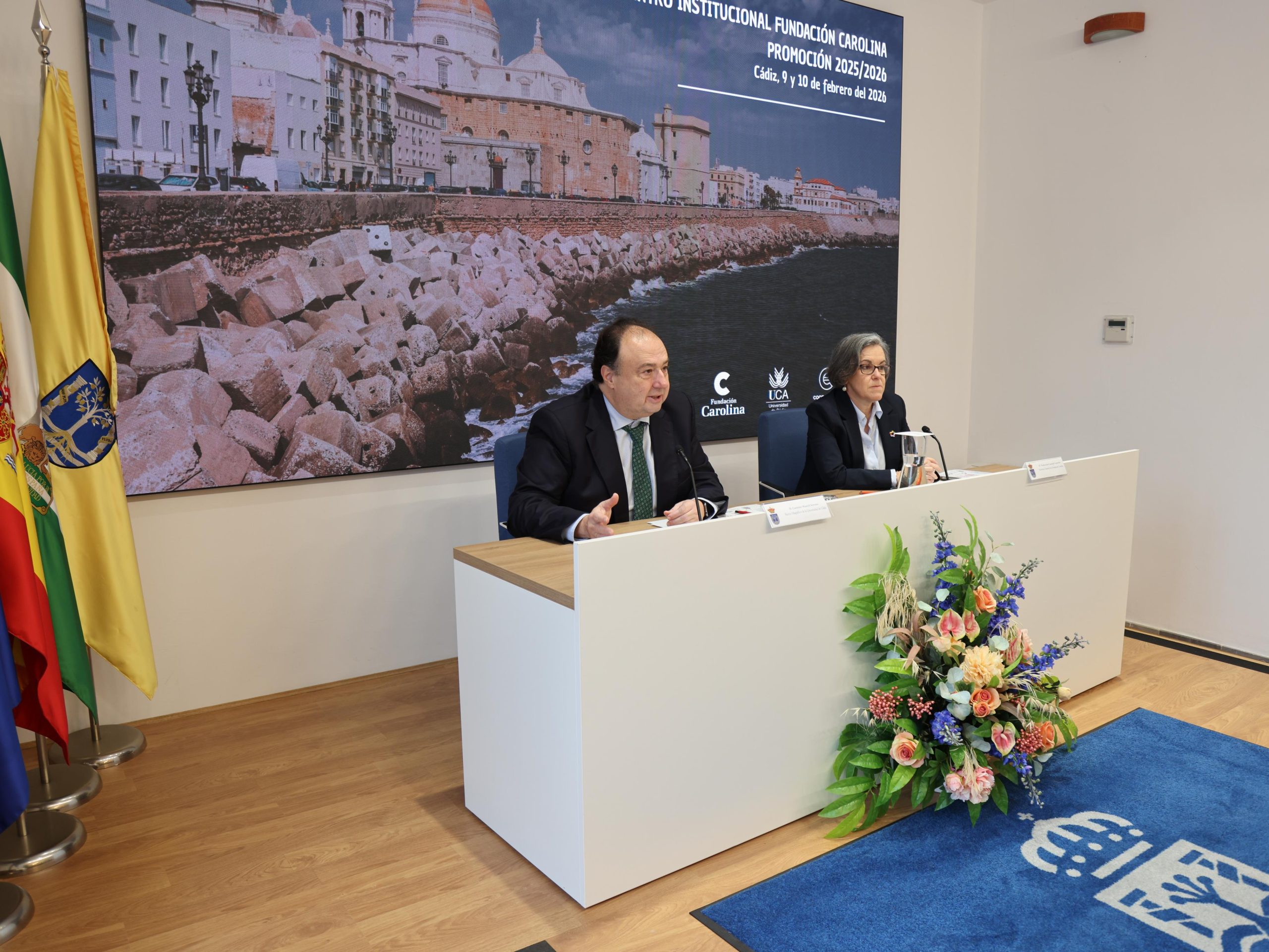 El encuentro ha sido inaugurado en la galería de rectores por el rector de la Universidad de Cádiz, Casimiro Mantell, y la secretaria general de la Fundación Carolina, Purificación Causapié, quienes han dado la bienvenida a las personas participantes en una jornada que también ha contado con una ponencia del catedrático de Arqueología Darío Bernal y un pequeño coloquio moderado por el vicerrector de Títulos y Calidad, Manuel Arcila.