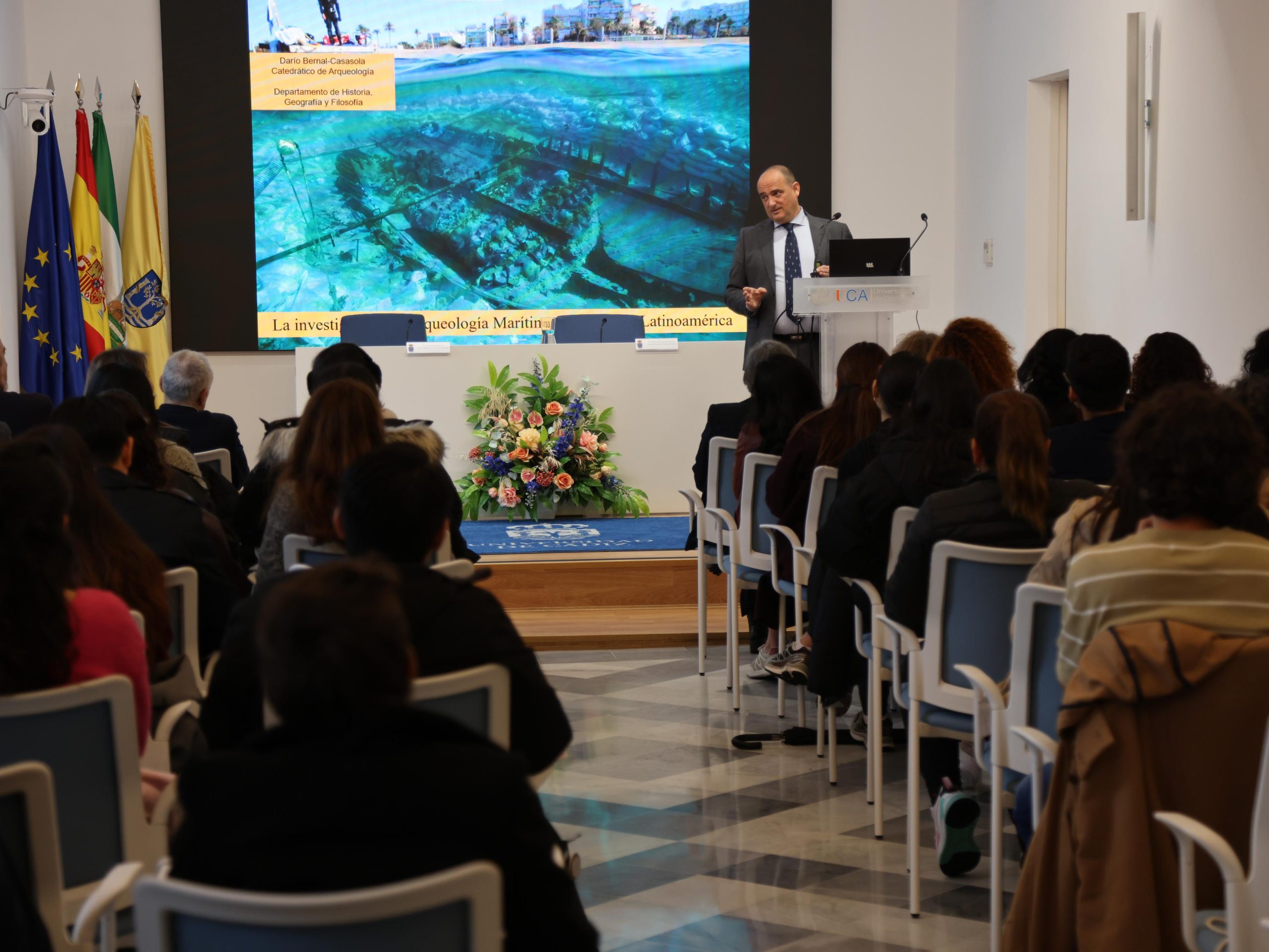 Tras las intervenciones institucionales, el rector ha presentado la conferencia impartida por Darío Bernal, titulada La investigación en Arqueología marítima y subacuática en España y Latinoamérica. La ponencia ha permitido mostrar a los participantes una de las líneas de investigación más distintivas de la UCA, vinculada al estudio del patrimonio arqueológico marítimo y subacuático, con especial proyección internacional. Además, el catedrático ha compartido con los alumnos algunos detalles de su experiencia en el trabajo cooperativo e internacional, animándoles a perseverar con ilusión y trabajo en sus áreas.