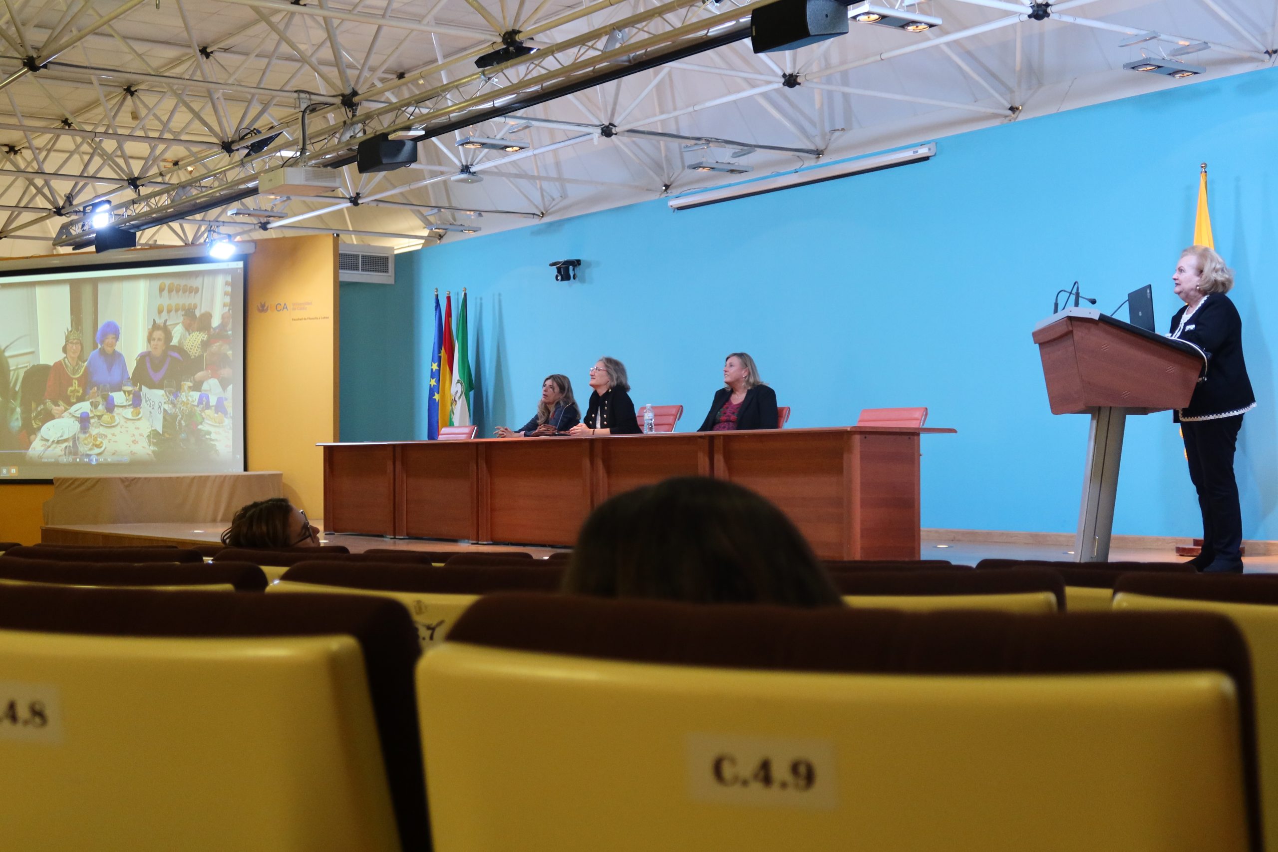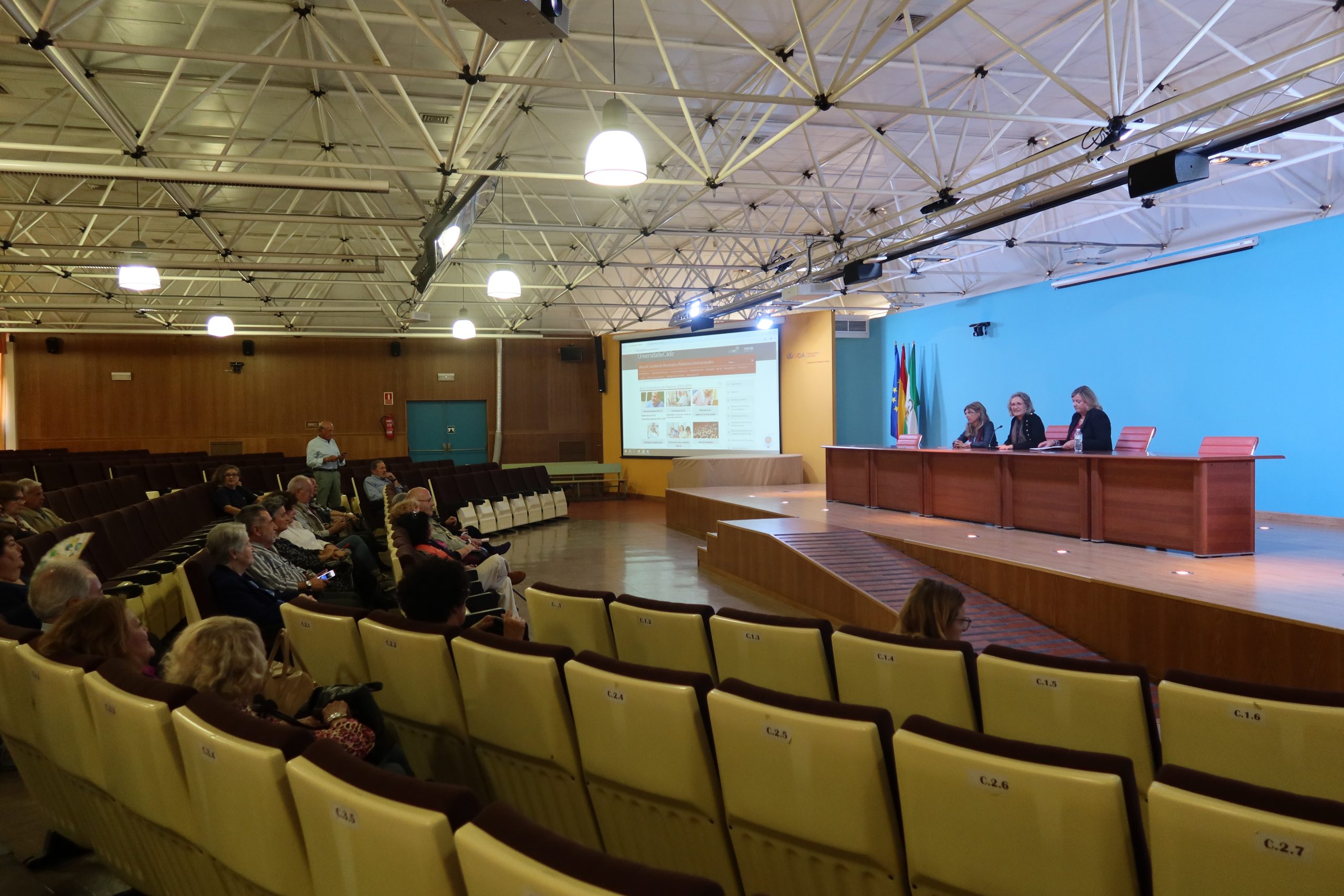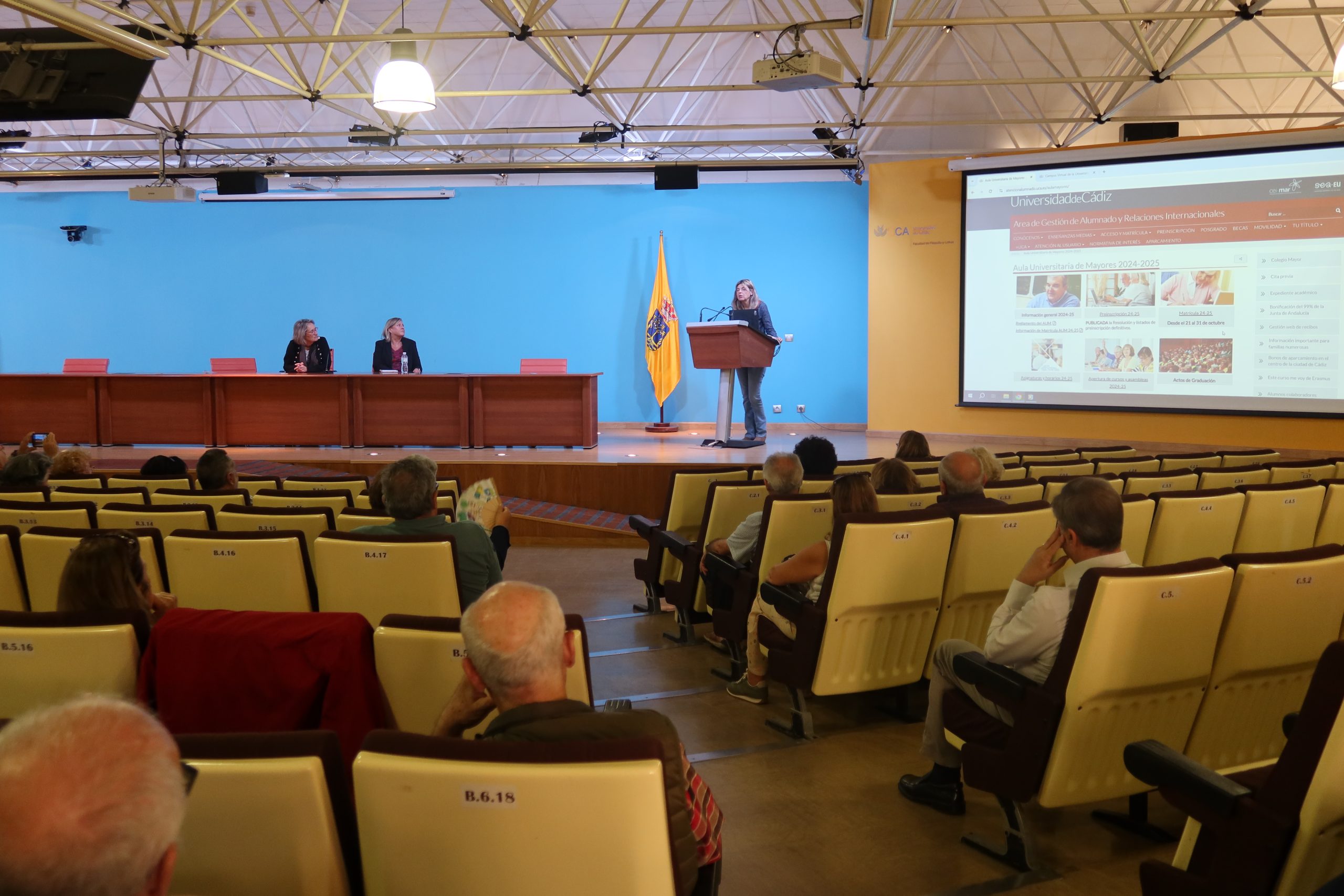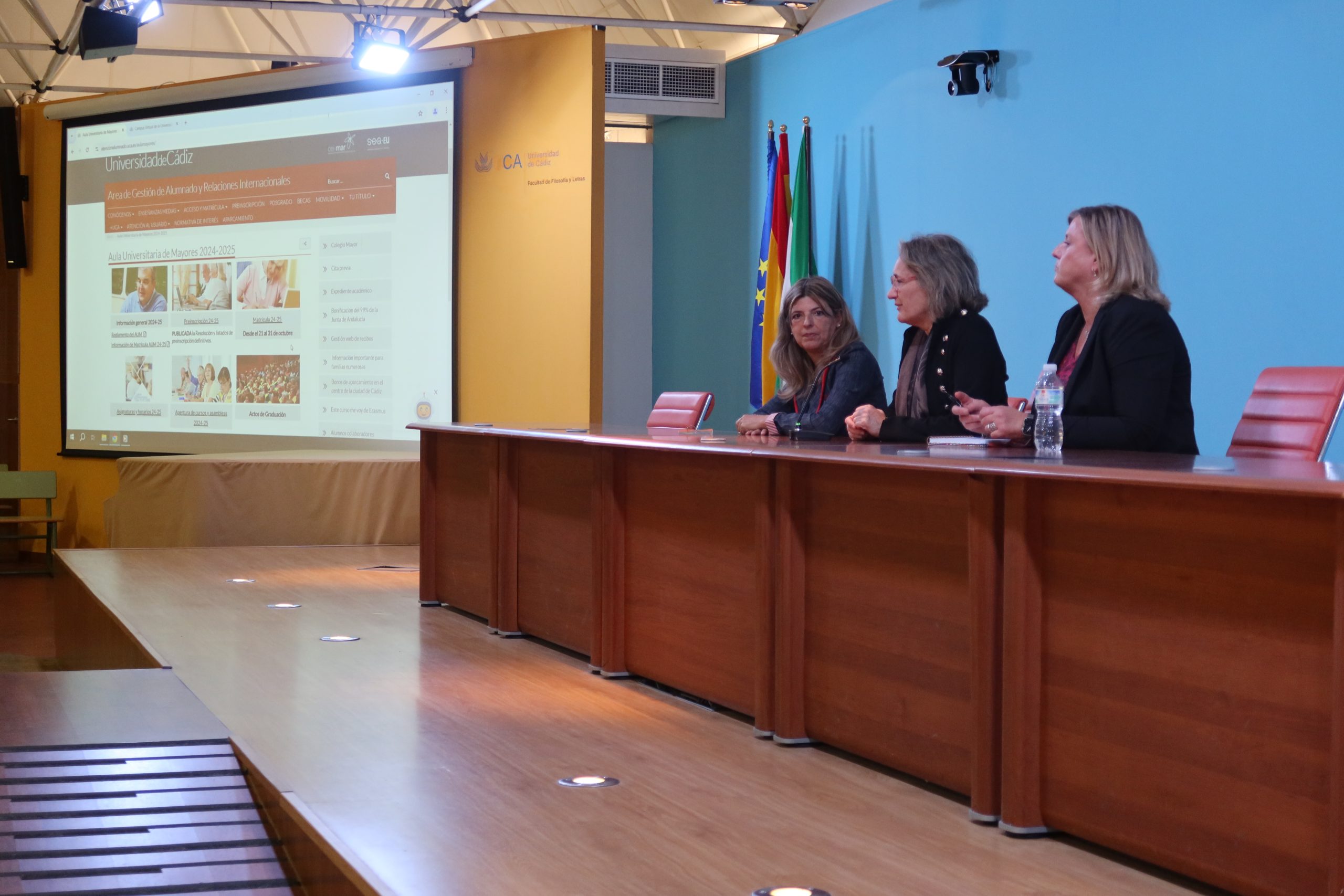El Aula Universitaria de Mayores (AUM) de la Universidad de Cádiz ha celebrado el acto de bienvenida para su alumnado en el Campus de Cádiz. La vicerrectora de Estudiantes, Nuria Campos, junto a la directora del AUM, María Jesús Paredes, y la subdirectora de la sede de Cádiz, Ana Mª Niveau de Villedary, ha presidido el acto en el aula Magna de la Facultad de Filosofía y Letras.