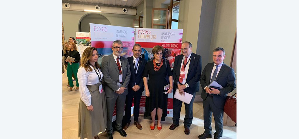 El Foro de Consejos Sociales de las Universidades Públicas de Andalucía ha inaugurado el Foro Convergia Universidad- Empresa en el Palacio de Congresos de Cádiz. El presidente del Foro, Prudencio Escamilla, junto a la secretaria General de Estado en funciones de Universidades, Investigación e Innovación, Ángeles Heras, el rector en funciones, Eduardo González Mazo, y electo de la UCA, Francisco Piniella, la directora General de Universidades de la Junta de Andalucía, Maria Inmaculada Ramos, el presidente de la Asociación de Universidades Públicas de Andalucía, el rector de Jaén, Juan Gómez, el subdelegado del Gobierno en funciones en Cádiz, José Antonio Pacheco, el presidente de la Confederación de Empresarios de la Provincia de Cádiz, Javier Sánchez Rojas, la delegada del Estado para la Zona Franca de Cádiz, Victoria Rodríguez, y el delegado territorial en Cádiz de Empleo, Formación, Trabajo Autónomo, y Economía, Conocimiento, Empresas de la Junta de Andalucía, Alberto Cremades, entre las autoridades asistentes.