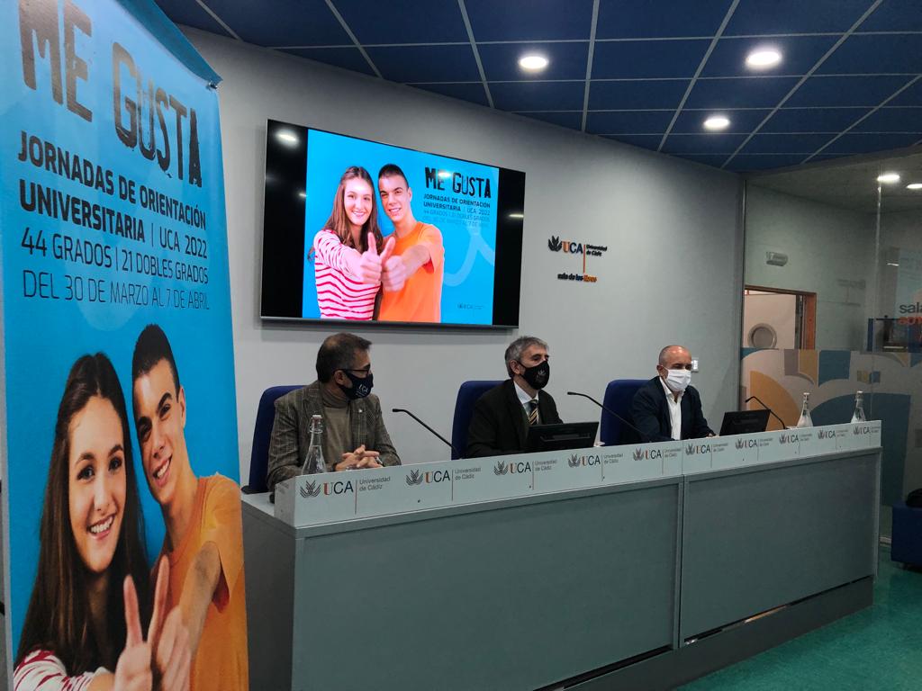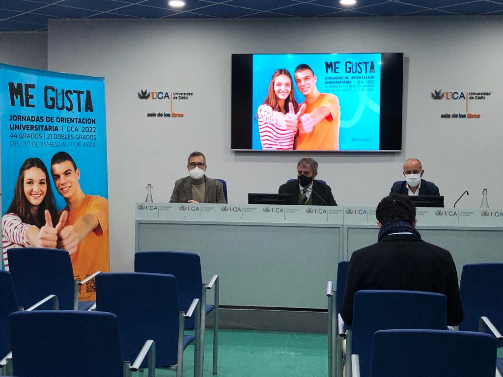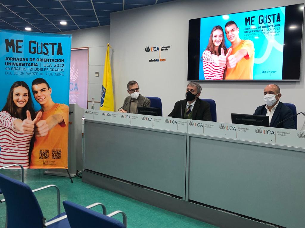 El rector de la Universidad de Cádiz, Francisco Piniella, en compañía del vicerrector de Estudiantes y Empleo, Manuel Sánchez, y del director General de Acceso y Orientación, Rodrigo Sánchez Ger, ha presentado hoy las XII Jornadas de Orientación Universitaria, que contemplan un intenso programa de desplazamientos y actuaciones con la finalidad de asesorar sobre el acceso y la oferta de grados y dobles grados a alumnado de segundo curso de Bachillerato y de Ciclos Formativos de Grado Superior. Además, se proporciona una información específica sobre los servicios de la UCA: Biblioteca, Deportes, Extensión Universitaria, Relaciones Internacionales, Colegio Mayor, Acción Social y Solidaria, Atención Psicológica y Psicopedagógica, Centro Superior de Lenguas Moderna y Servicio de Atención a la Discapacidad.
