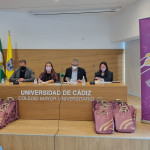 El rector de la Universidad de Cádiz, Francisco Piniella, en compañía de la asesora de Programas del Instituto Andaluz de la Mujer en Cádiz, Celia Mañueco, del vicerrector de Estudiantes y Empleo, Manuel Sánchez, del director General del Centro de Promoción de Empleo y Prácticas, Luis López, y la delegada del Rector para Políticas de Igualdad e Inclusión, Maika García, ha presentado hoy, en el salón de Actos del Colegio Mayor Universitario, el Programa UNIVERGEM 2021/22, que se dirige a universitarias para mejorar su empleabilidad.