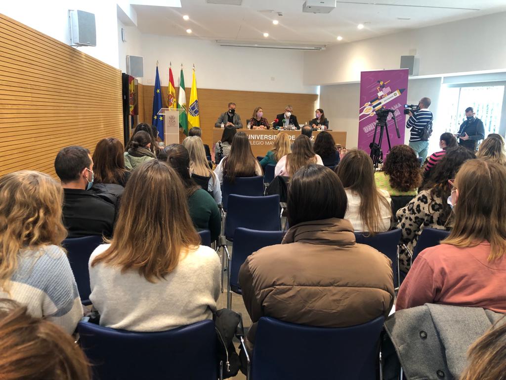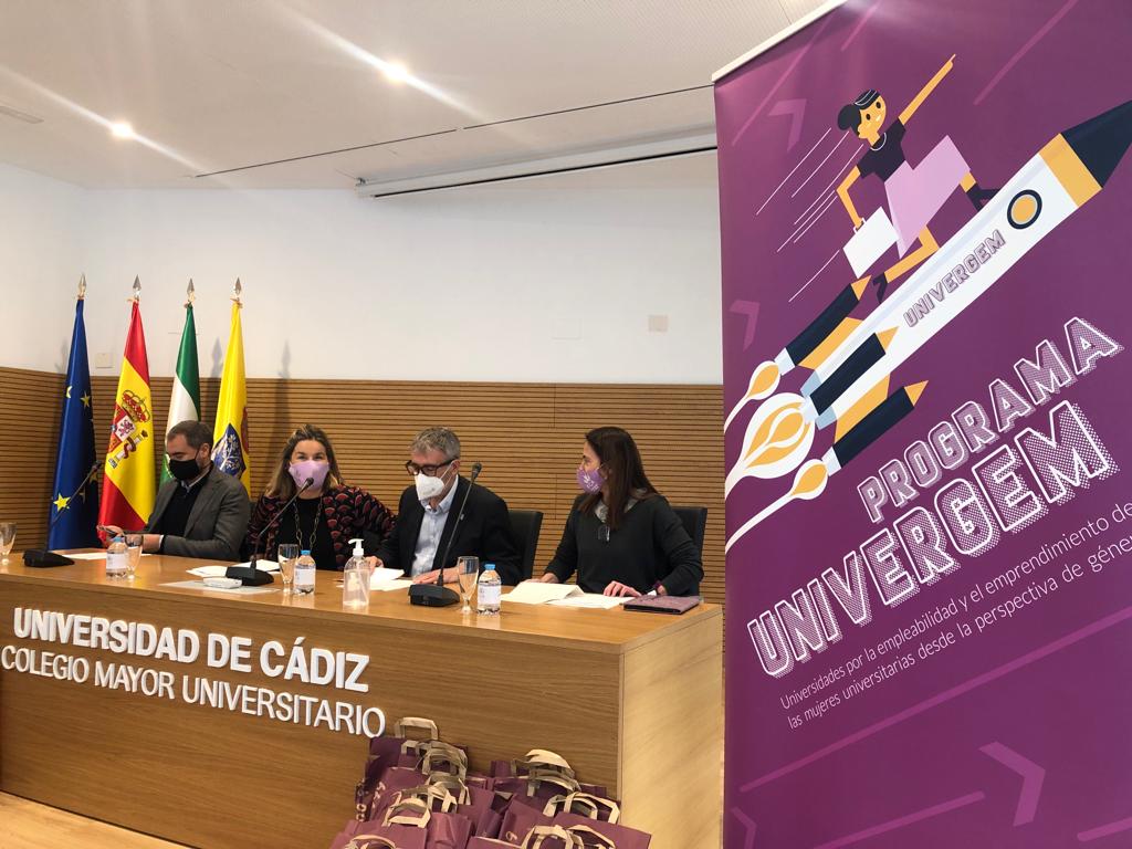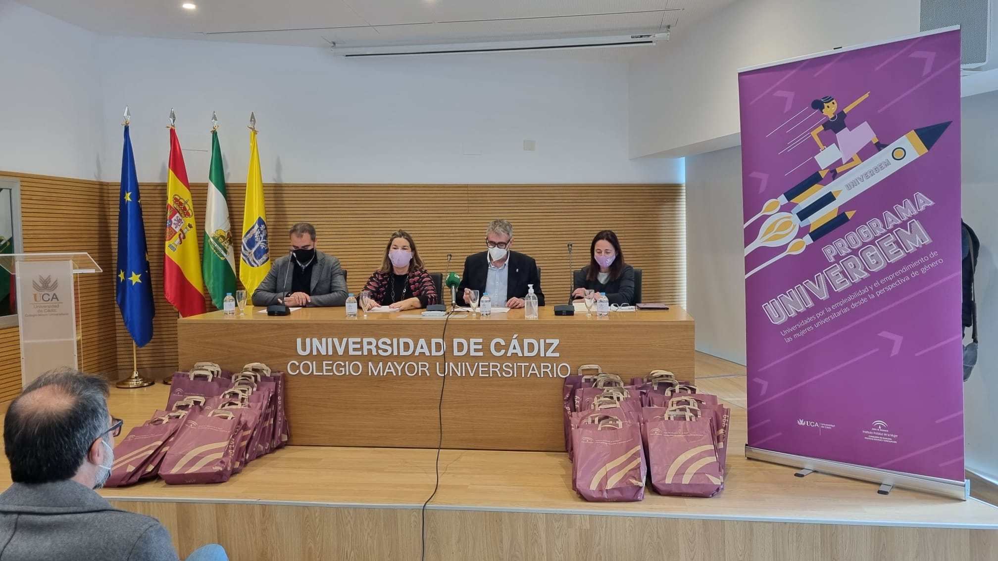 El rector de la Universidad de Cádiz, Francisco Piniella, en compañía de la asesora de Programas del Instituto Andaluz de la Mujer en Cádiz, Celia Mañueco, del vicerrector de Estudiantes y Empleo, Manuel Sánchez, del director General del Centro de Promoción de Empleo y Prácticas, Luis López, y la delegada del Rector para Políticas de Igualdad e Inclusión, Maika García, ha presentado hoy, en el salón de Actos del Colegio Mayor Universitario, el Programa UNIVERGEM 2021/22, que se dirige a universitarias para mejorar su empleabilidad.