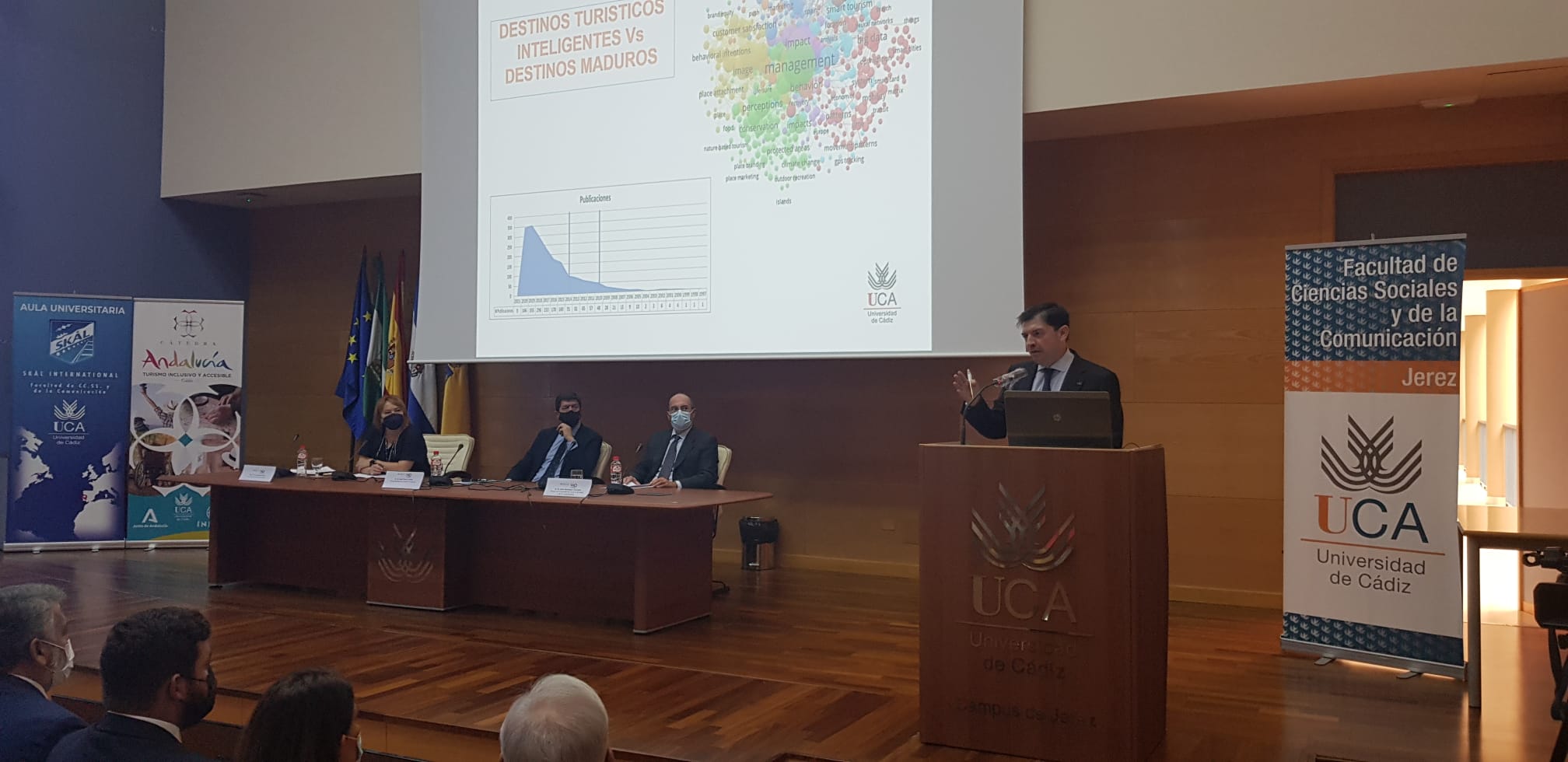 A continuación, el profesor José Antonio López ha pronunciado la lección inaugural “Los destinos turísticos inteligentes como paradigma de los destinos maduros” en donde ha señalado que “el turismo litoral es el principal espacio turístico”, pero se caracteriza por “una gran presión urbanística que lo sitúa en una fase crítica y sin buena planificación”, que obligará, en consecuencia, “a un ajuste de destinos”. Se trata, ha reconocido, de “un tipo de turismo maduro que requiere nuevas fórmulas basadas en la sostenibilidad y la innovación y de nuevas modelos de gestión”. En suma, se plantea la necesidad de implementar “nuevas estrategias para solucionar modelos turísticos agotados por su insostenibilidad, dificultades de gestión y escasez de recursos” en un contexto donde perviven “dos realidades cambiantes: la del territorio y la del turista, que viaja más informado y se encuentra híper conectado”. Estamos, por tanto, ante una “nueva realidad y concienciación ambiental que demanda destinos turísticos inteligentes, sostenibles y asequibles, que usan las nuevas tecnologías de análisis a través principalmente de la big data”. Un ejemplo, ha precisado, es la ciudad de Benidorm en la apuesta de un destino turístico inteligente dentro de un plan estratégico que, tras analizar entre 2009 y 2019 un total de 18 indicadores, “da buenos resultados a medio y largo plazo” en los planos “energético, de residuos, empleo y sostenibilidad”.