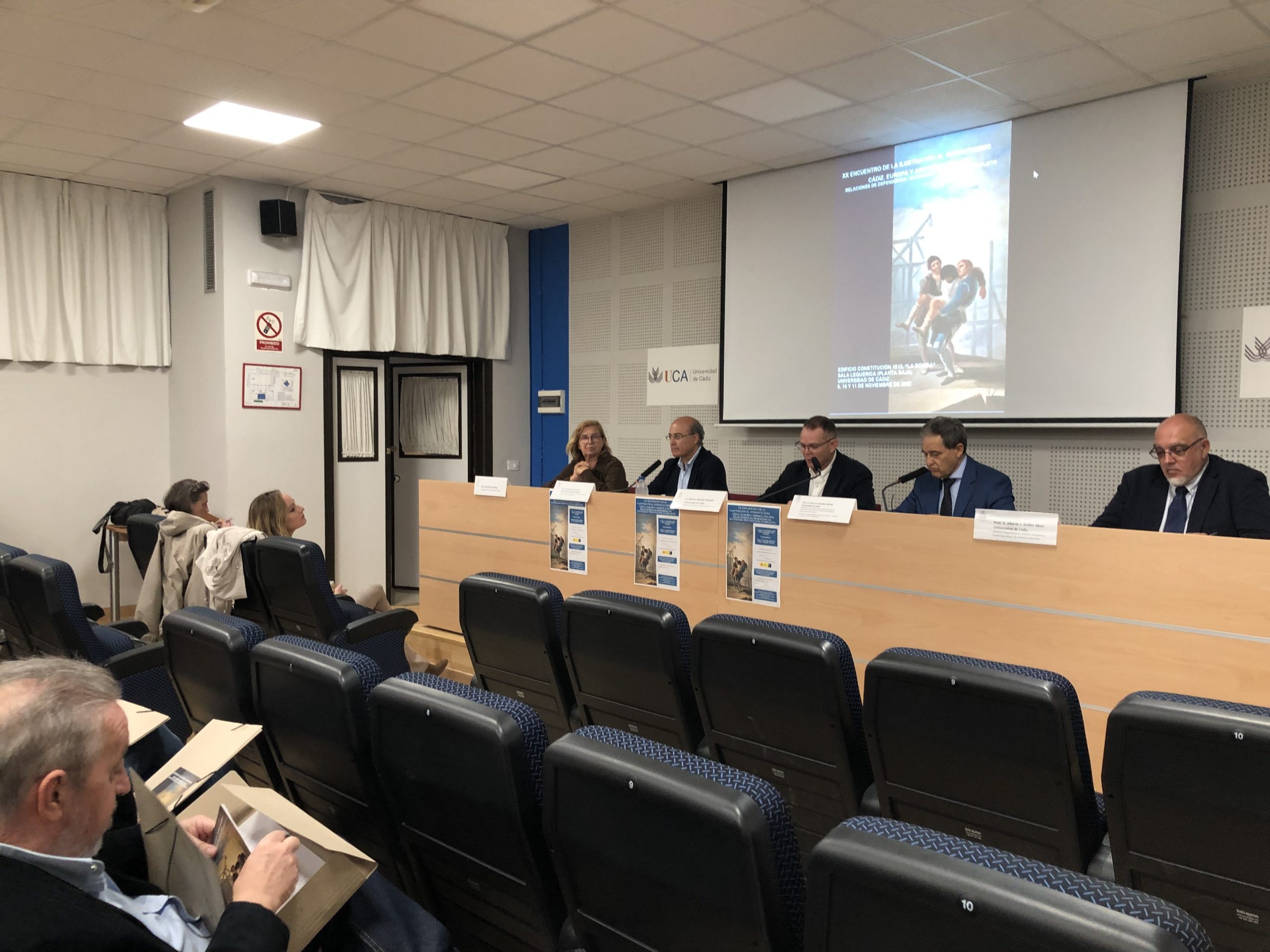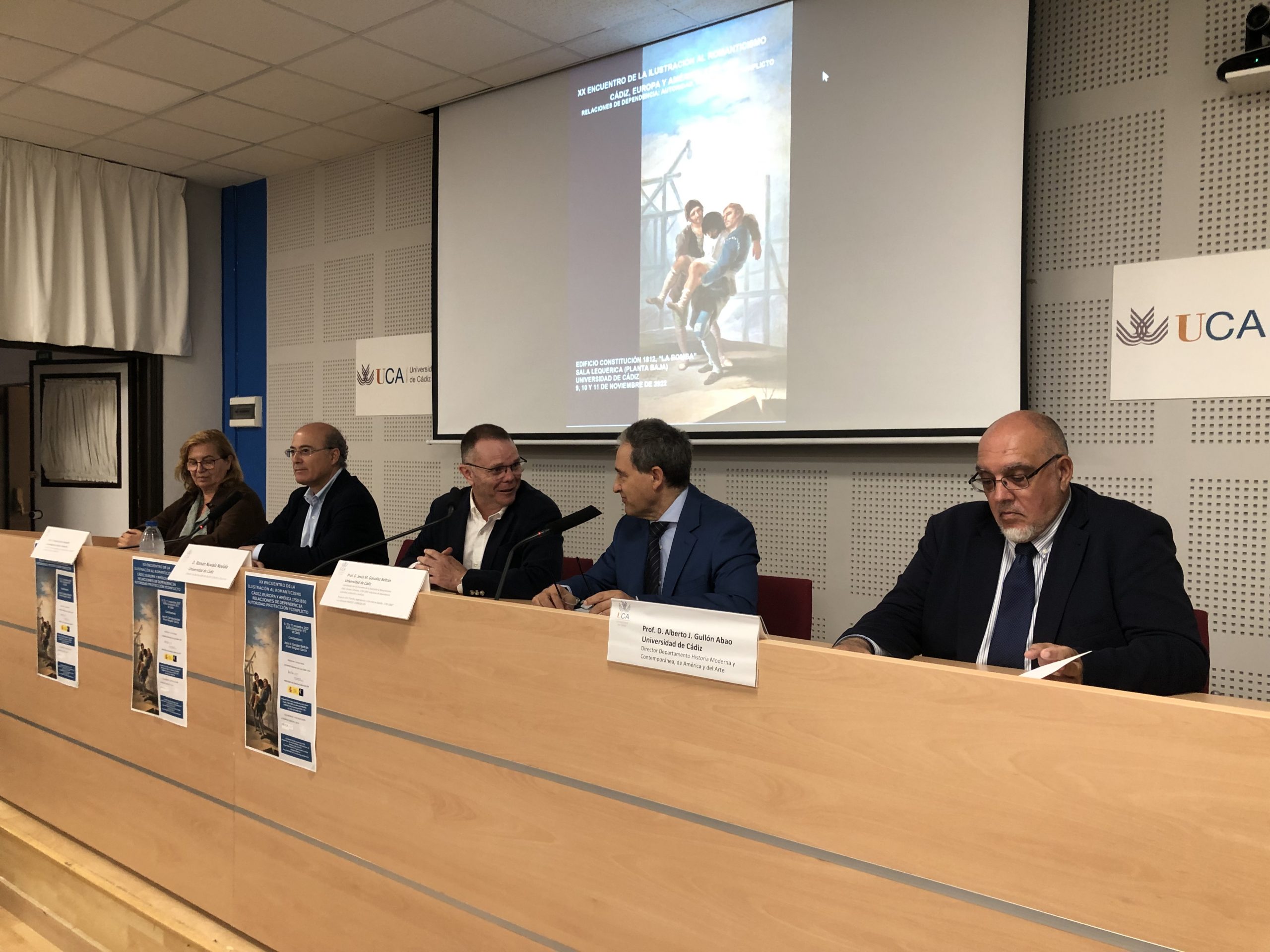 El director de secretariado de Acción Cultural y Deportes del Vicerrectorado de Cultura de la Universidad de Cádiz, Román Nuviala, junto al coordinador del XX Encuentro de la Ilustración al Romanticismo, Jesús M. González, el profesor de la Universidad de Castilla- la Mancha, Francisco García González, la consejera del Consejo Social de la UCA, Rita Benítez, y el director del departamento de Historia Moderna y Contemporánea, de América y del Arte de la UCA, Alberto J. Gullón, han presidido el acto inaugural en la sala Lequerica.