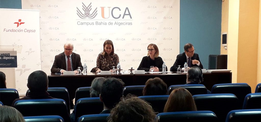 La Universidad de Cádiz y la Fundación Cátedra CEPSA, desde la Cátedra Fundación CEPSA de la UCA, han celebrado hoy la inauguración de la sala de proyección audiovisual MOOC de la Escuela Politécnica Superior de Algeciras, y la entrega de los Premios Cátedra CEPSA 2019. La vicerrectora de Política Científica y Tecnológica, Mª Jesús Mosquera, junto a los directores de la EPS de Algeciras, Gabriel González Siles, de la Cátedra Fundación Cepsa, Francisco Trujillo, y de la Refinería Gibraltar-San Roque de Cepsa, Miguel Pérez de la Blanca, y la representante de la Fundación Cepsa, Estrella Blanco, han dado la bienvenida en la Escuela.