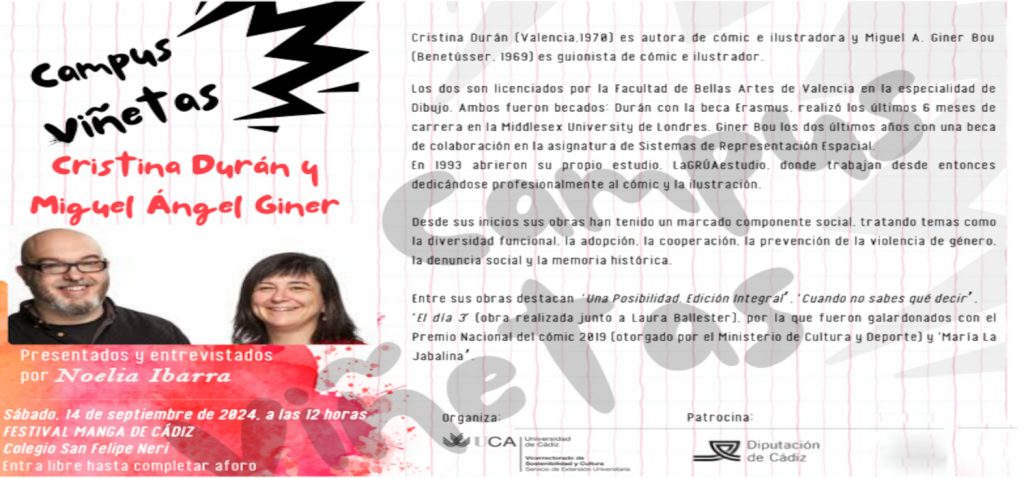 El servicio de Extensión Universitaria del Vicerrectorado de Sostenibilidad y Cultura de la Universidad de Cádiz ha programado para el próximo sábado 14 de septiembre, a las 12 horas y en el Colegio San Felipe Neri de Cádiz, la tercera cita de Campus Viñetas, una propuesta centrada en el cómic y la historieta que, en 2024, contará con los creadores gráficos Cristina Durán y Miguel Ángel Giner Bou.