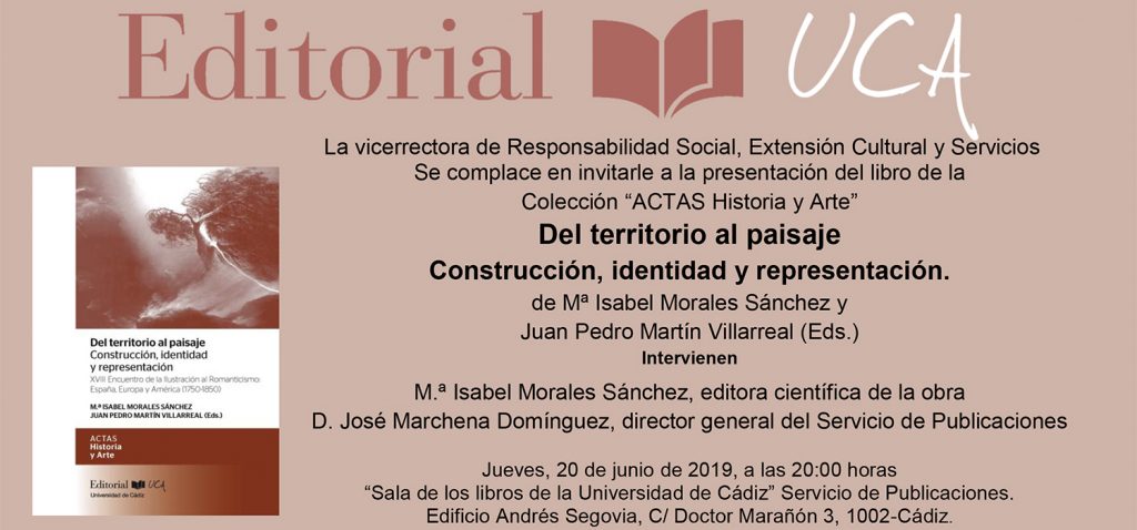 El sello Editorial UCA presentará mañana, jueves 20, a las 20:00 horas y en la sala de Los Libros del edificio Andrés Segovia, su último título Del territorio al paisaje. Construcción identidad y representación, de la colección ACTAS Historia y Arte, cuyos editores científicos son Mª Isabel Morales Sánchez y Juan Pedro Martín Villarreal. En el acto participarán Mª Isabel Morales Sánchez, profesora titular de Teoría de la Literatura de la UCA, y José Marchena, director General en funciones de Extensión Cultural y del Servicio de Publicaciones de Universidad de Cádiz.