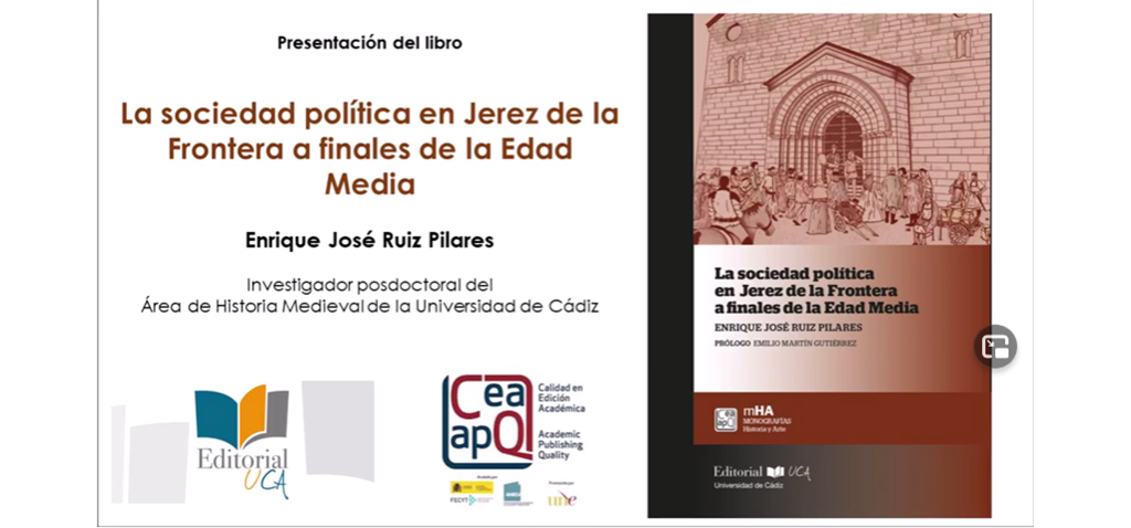 El Vicerrectorado de Cultura de la Universidad de Cádiz, desde la Editorial UCA, ha presentado de forma virtual el libro La sociedad política de Jerez de la Frontera a finales de la Edad Media, de Enrique José Ruiz Pilares, perteneciente a la colección Monografías de Historia y Arte.