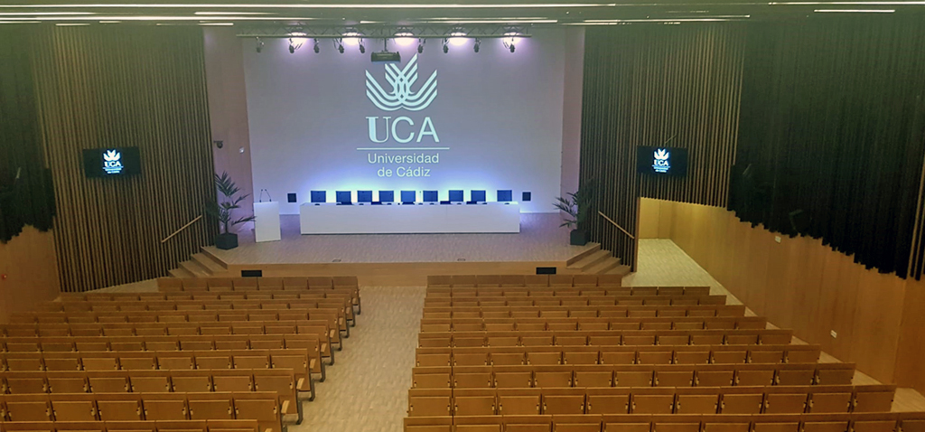 La remodelación del espacio ha incluido la renovación de todos los revestimientos de paredes, techo y suelo, la instalación de un nuevo estrado, patio de butacas y sala de control, así como un acondicionamiento integral térmico y de ventilación y un estudio avanzado acústico y de iluminación. El conjunto de actuaciones llevadas a cabo ha permitido actualizar esta infraestructura tanto a las nuevas exigencias normativas como a los estándares de calidad de la UCA. Entre ellas, han sido objeto de revisión la seguridad en caso de incendios, la seguridad de utilización y eliminación de las barreras arquitectónicas, la modernización e implementación de las instalaciones y medios audiovisuales, la mejora de la iluminación y la acústica, así como la implementación de un innovador diseño para ganar en versatilidad y renovar por completo su imagen. Este nuevo equipamiento cuenta con un total de 342 butacas (con un coste de 92.696 euros) con atril para garantizar un uso más polivalente.