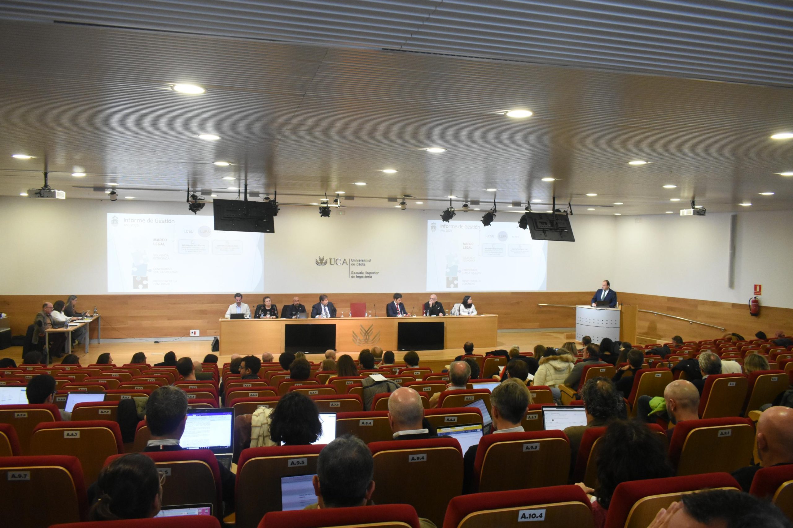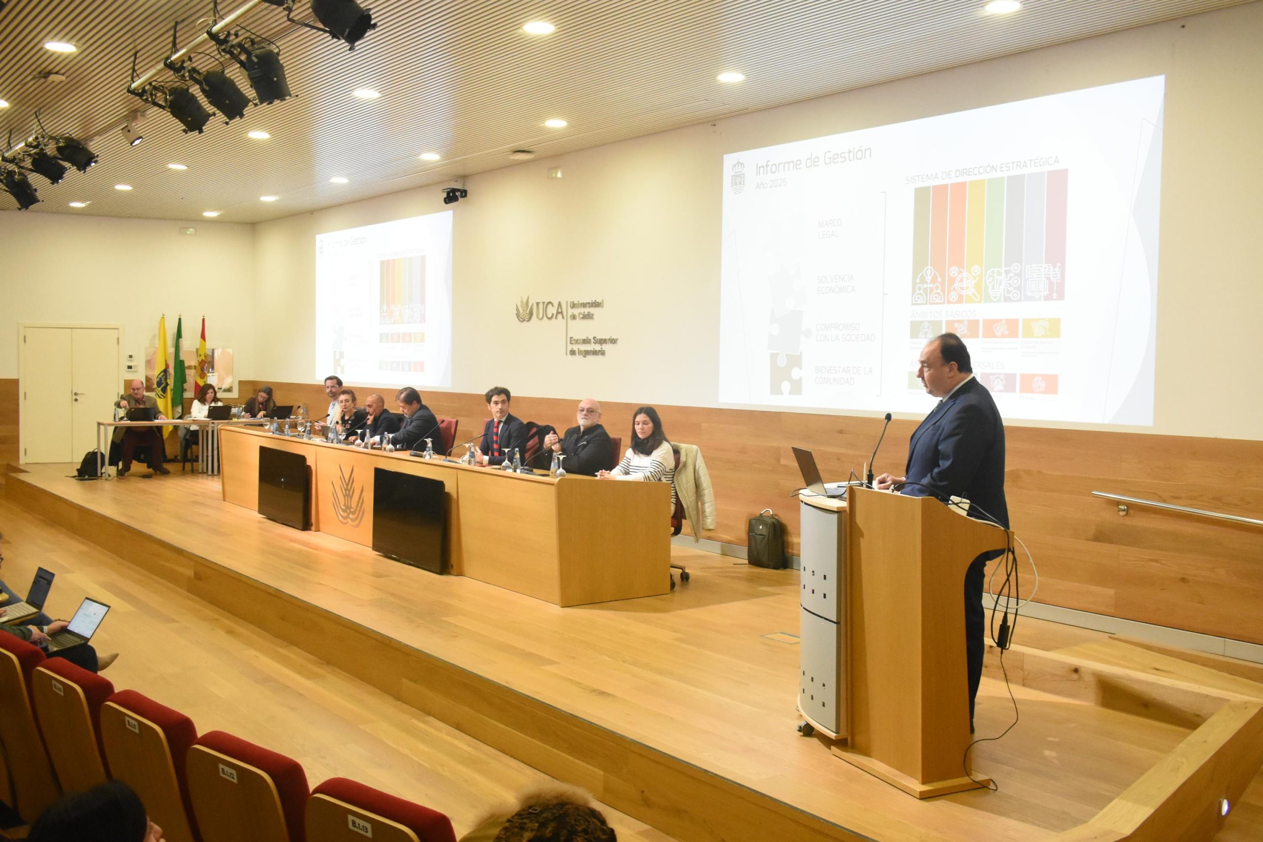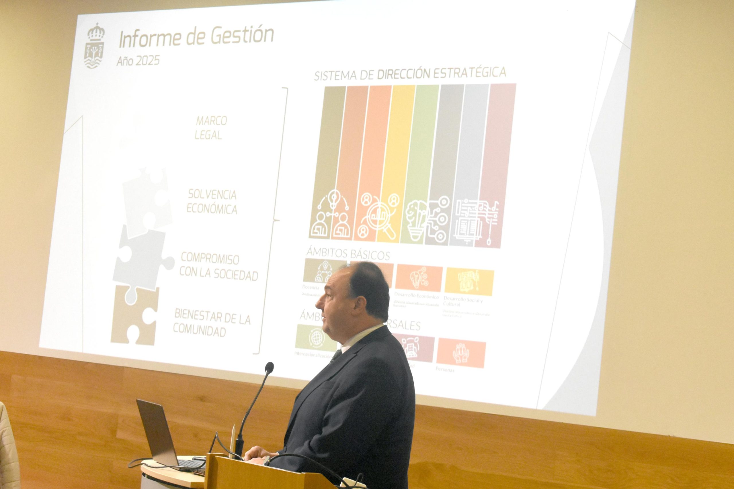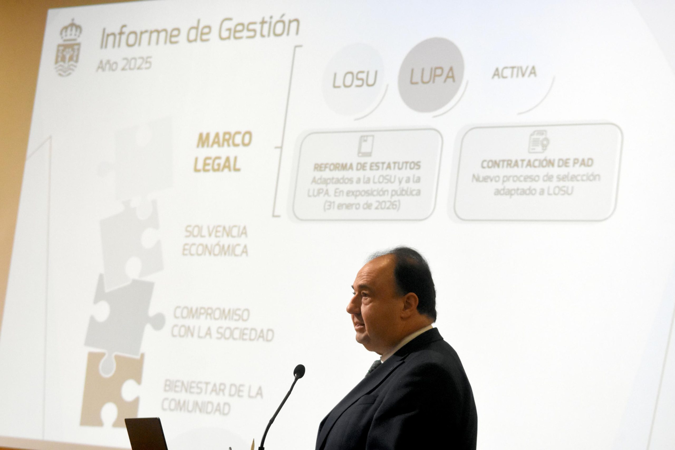 El documento organiza el balance del año en cuatro grandes ejes: marco legal, solvencia económica, compromiso con la sociedad y bienestar de la comunidad universitaria. El rector ha iniciado su intervención recordando la adaptación de la universidad a la LOSU y la LUPA, que impulsa la reforma de los Estatutos —en exposición pública hasta el 31 de enero—, junto con un nuevo proceso de selección para la contratación de Profesorado Ayudante Doctor (PAD).
